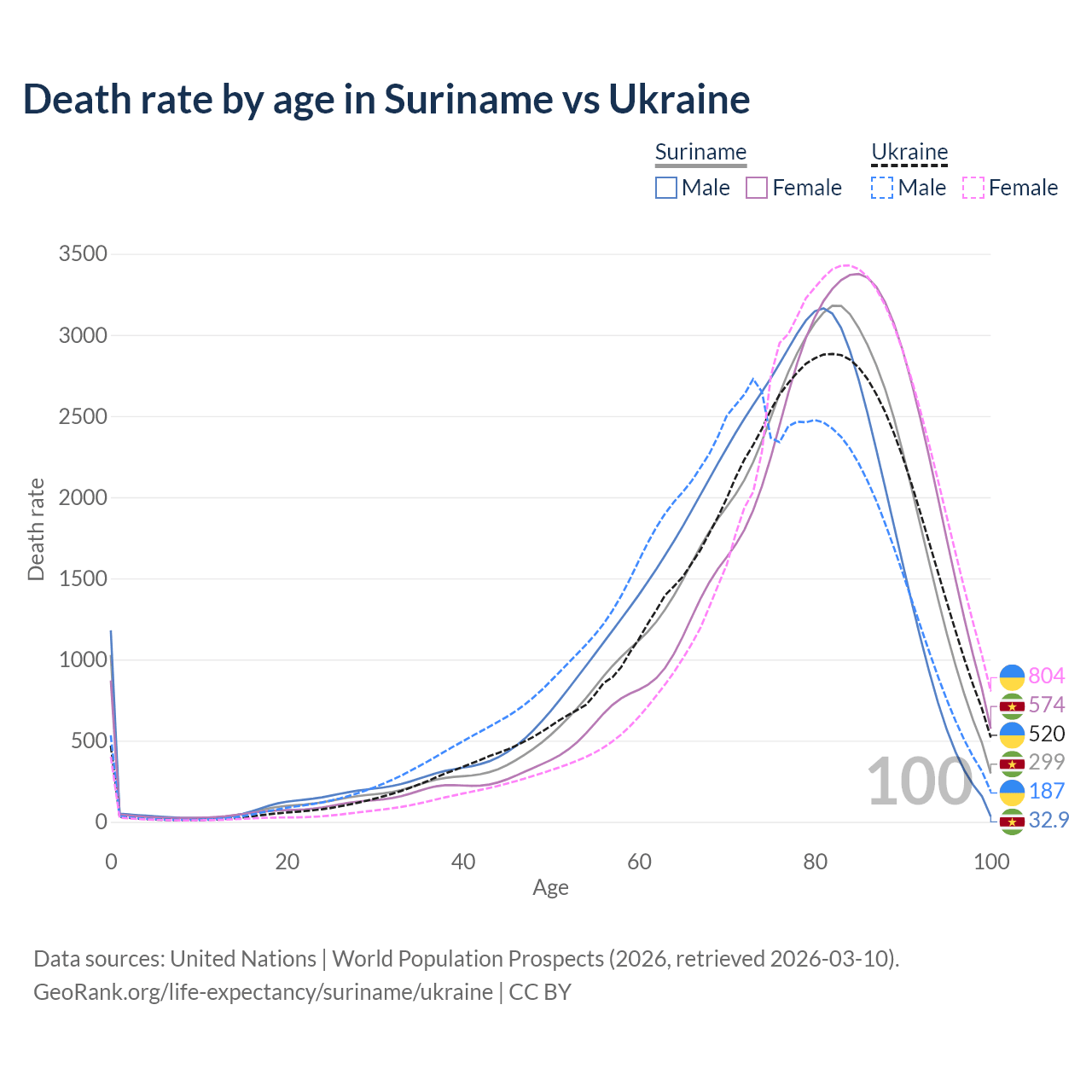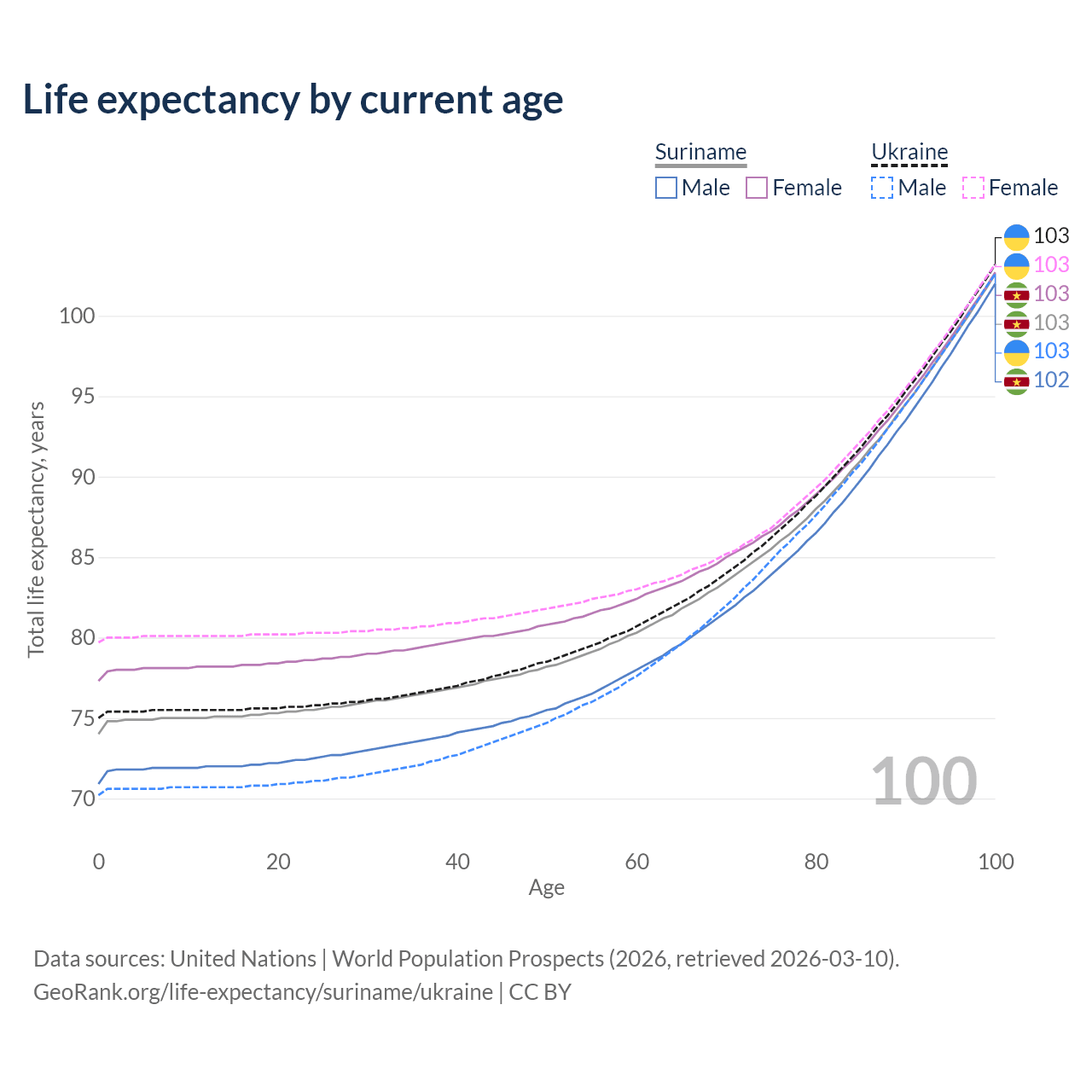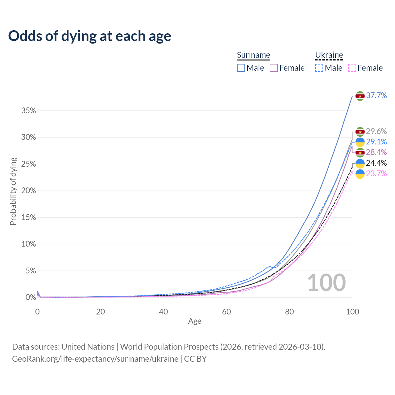 This life expectancy calculator shows the odds of living to 100, 95, 90, and below based on current age for both males and females in Suriname and Ukraine, along with mean and median age of death. The calculations are based on the 2026 life tables (actuarial tables) from the UN World Population Prospects.