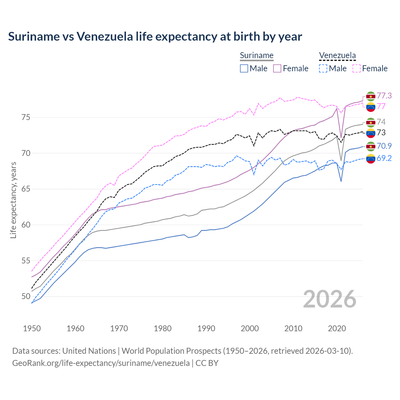 The average life expectancy at birth is 74 years in Suriname vs 73 in Venezuela. Suriname is ranked 103/197 by life expectancy, and Venezuela is 114/197. In Suriname, the life expectancy is 70.9 years for males and 77.3 years for females. In Venezuela, it's 69.2 years for males and 77 years for females.