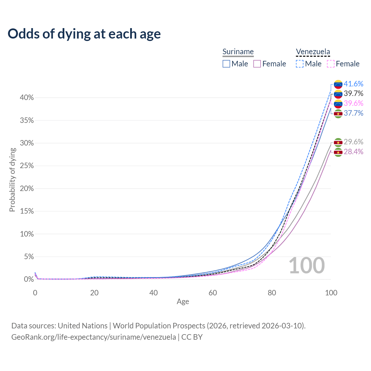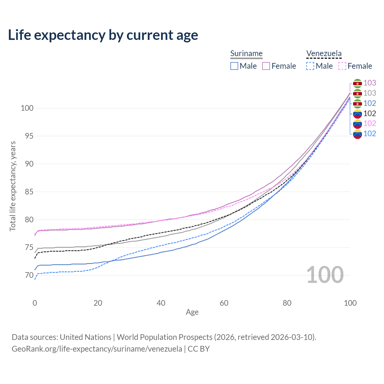 This life expectancy calculator shows the odds of living to 100, 95, 90, and below based on current age for both males and females in Suriname and Venezuela, along with mean and median age of death. The calculations are based on the 2026 life tables (actuarial tables) from the UN World Population Prospects.