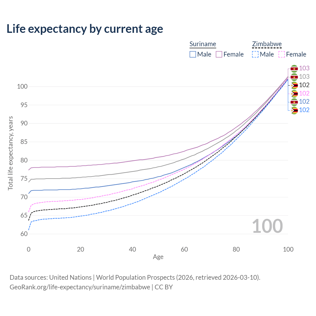 This life expectancy calculator shows the odds of living to 100, 95, 90, and below based on current age for both males and females in Suriname and Zimbabwe, along with mean and median age of death. The calculations are based on the 2026 life tables (actuarial tables) from the UN World Population Prospects.