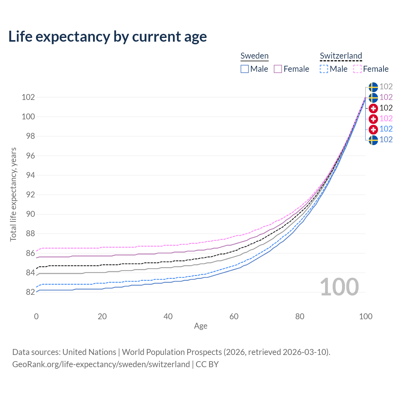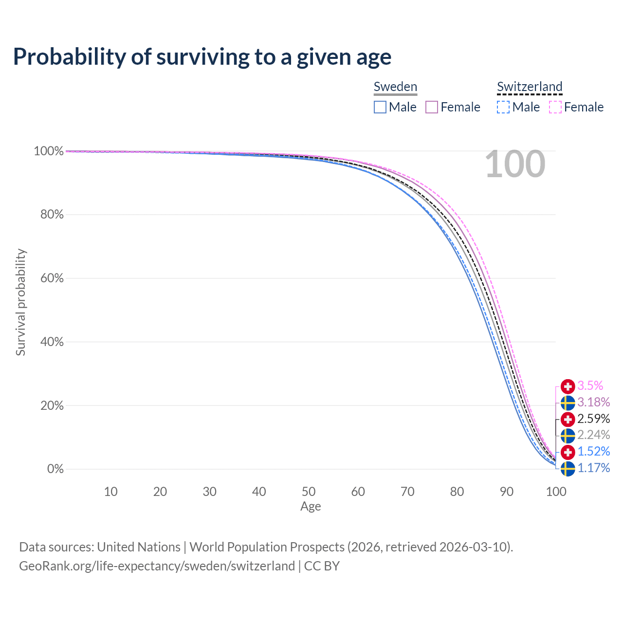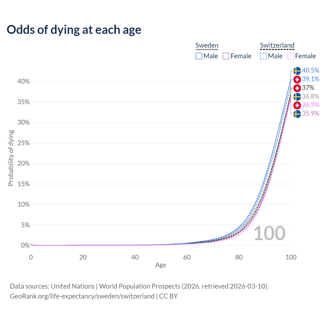 This life expectancy calculator shows the odds of living to 100, 95, 90, and below based on current age for both males and females in Sweden and Switzerland, along with mean and median age of death. The calculations are based on the 2026 life tables (actuarial tables) from the UN World Population Prospects.