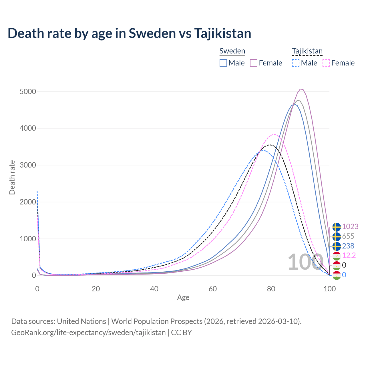In Sweden, the most common age of death is 89, compared to 80 in Tajikistan. The median age of death is 86.5 in Sweden and 76 in Tajikistan, meaning only half of each cohort is expected to live past that age.