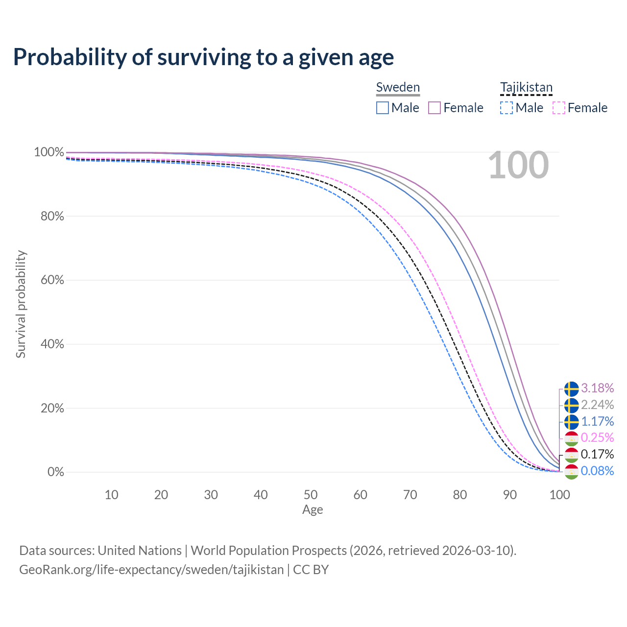 This life expectancy calculator shows the odds of living to 100, 95, 90, and below based on current age for both males and females in Sweden and Tajikistan, along with mean and median age of death. The calculations are based on the 2026 life tables (actuarial tables) from the UN World Population Prospects.