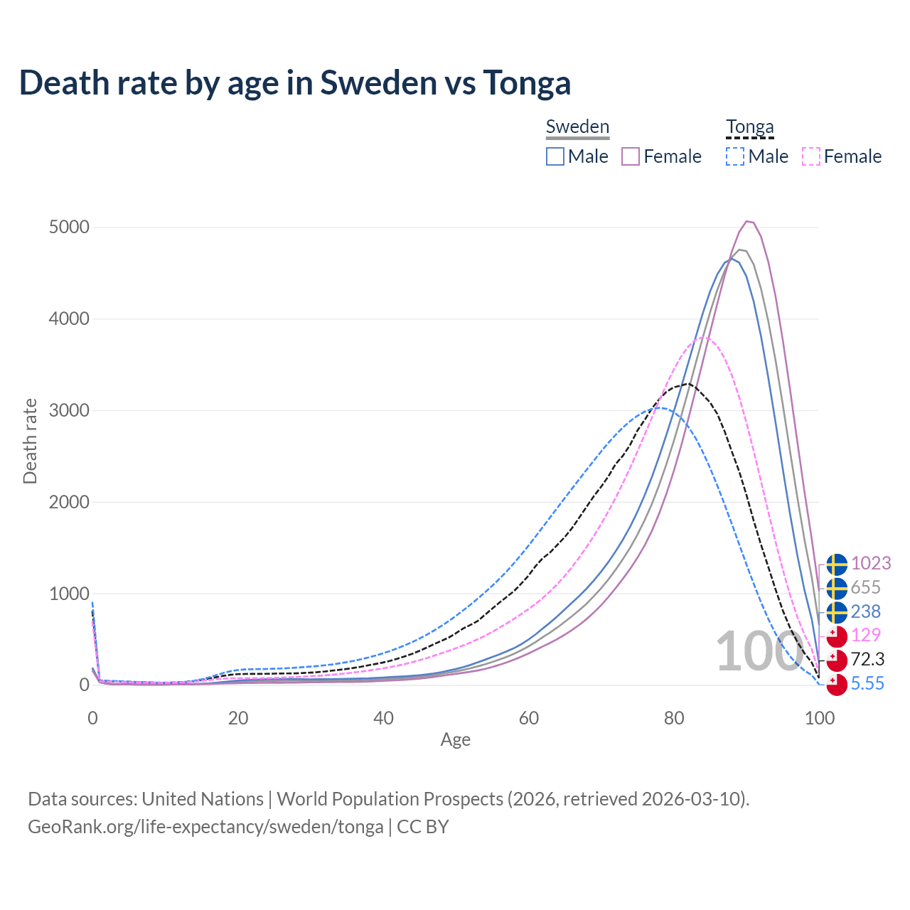 In Sweden, the most common age of death is 89, compared to 82 in Tonga. The median age of death is 86.5 in Sweden and 77 in Tonga, meaning only half of each cohort is expected to live past that age.