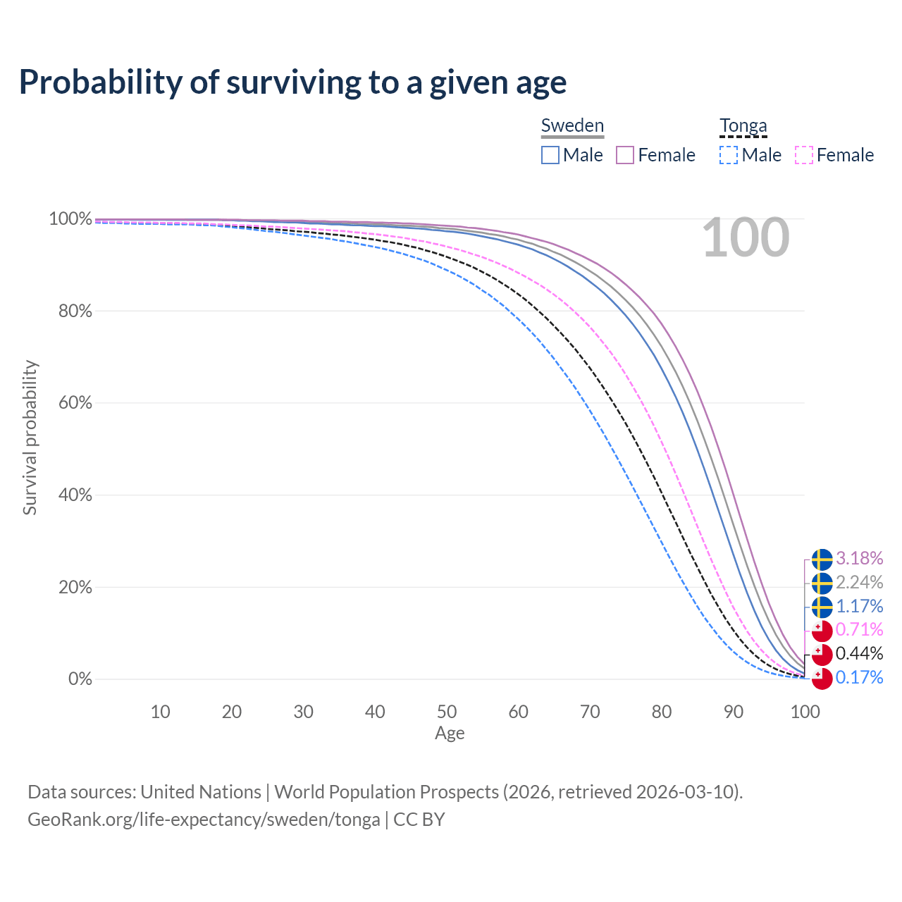 This life expectancy calculator shows the odds of living to 100, 95, 90, and below based on current age for both males and females in Sweden and Tonga, along with mean and median age of death. The calculations are based on the 2026 life tables (actuarial tables) from the UN World Population Prospects.