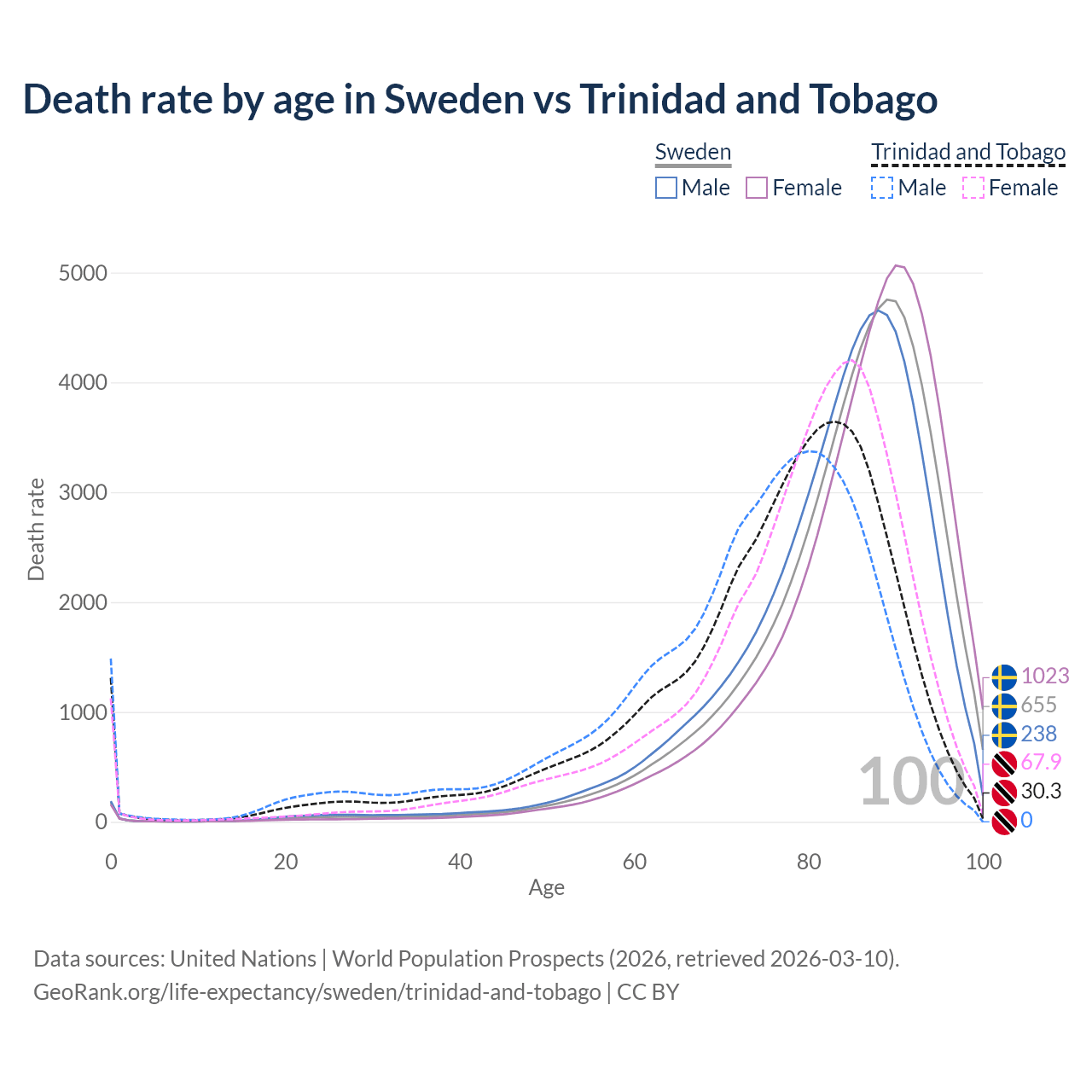 In Sweden, the most common age of death is 89, compared to 83 in Trinidad and Tobago. The median age of death is 86.5 in Sweden and 78.4 in Trinidad and Tobago, meaning only half of each cohort is expected to live past that age.