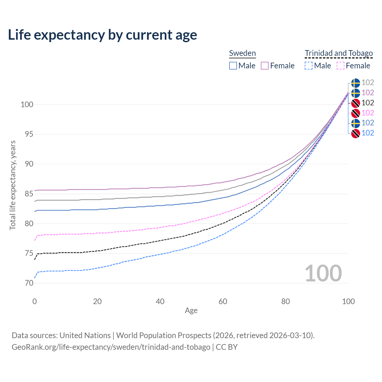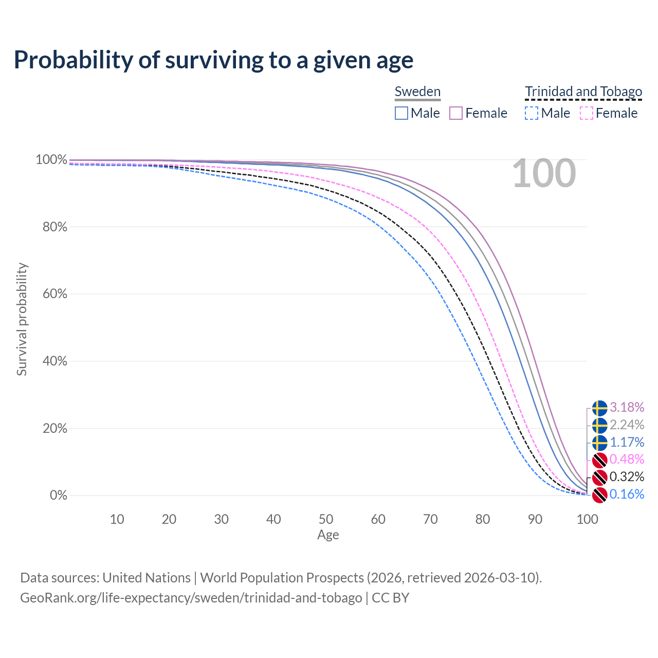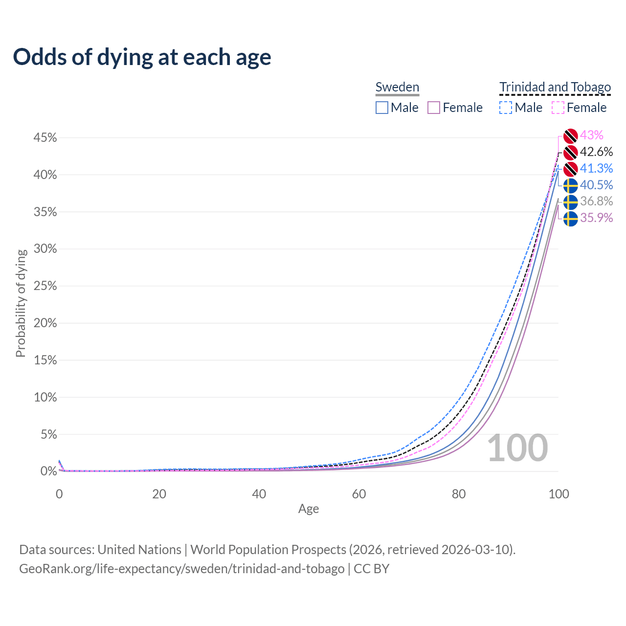 This life expectancy calculator shows the odds of living to 100, 95, 90, and below based on current age for both males and females in Sweden and Trinidad and Tobago, along with mean and median age of death. The calculations are based on the 2026 life tables (actuarial tables) from the UN World Population Prospects.