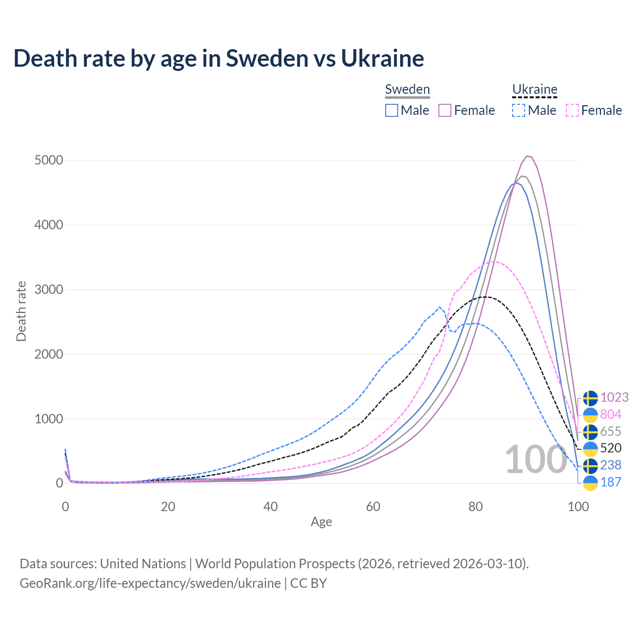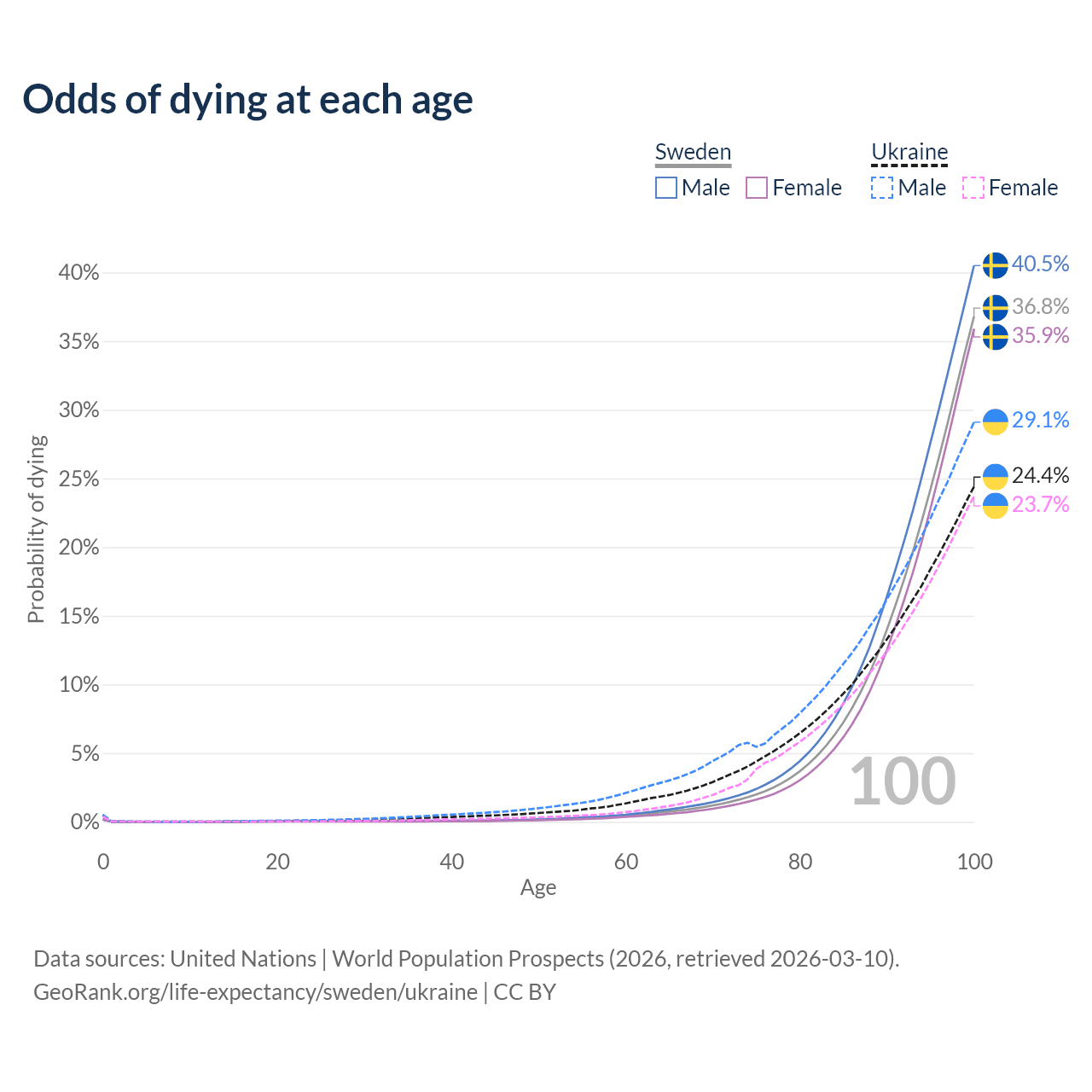 This life expectancy calculator shows the odds of living to 100, 95, 90, and below based on current age for both males and females in Sweden and Ukraine, along with mean and median age of death. The calculations are based on the 2026 life tables (actuarial tables) from the UN World Population Prospects.