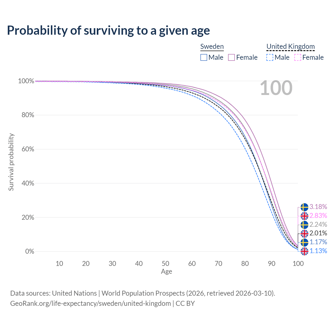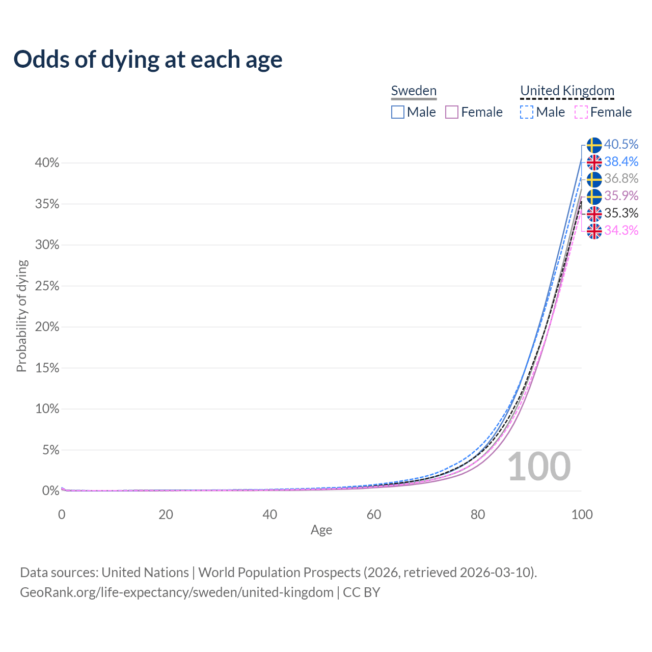 This life expectancy calculator shows the odds of living to 100, 95, 90, and below based on current age for both males and females in Sweden and the United Kingdom, along with mean and median age of death. The calculations are based on the 2026 life tables (actuarial tables) from the UN World Population Prospects.