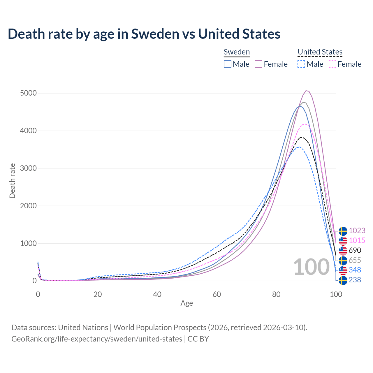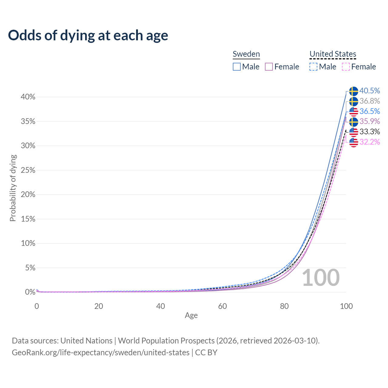 This life expectancy calculator shows the odds of living to 100, 95, 90, and below based on current age for both males and females in Sweden and the United States, along with mean and median age of death. The calculations are based on the 2026 life tables (actuarial tables) from the UN World Population Prospects.