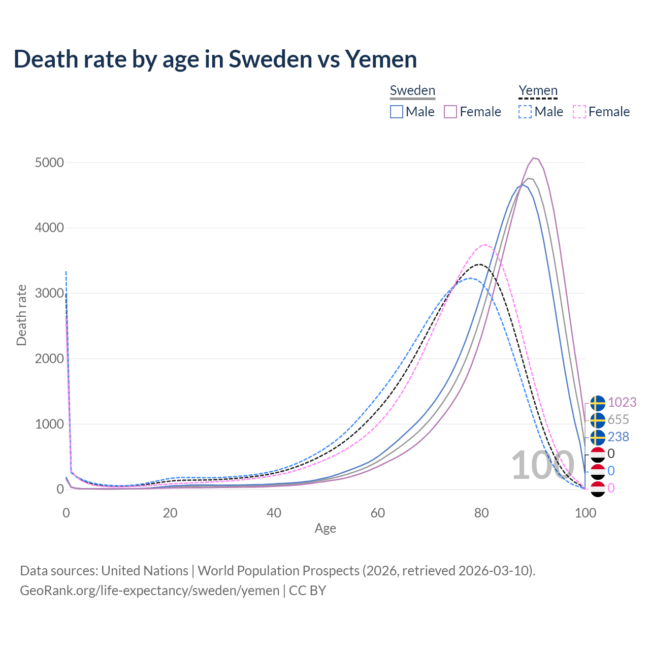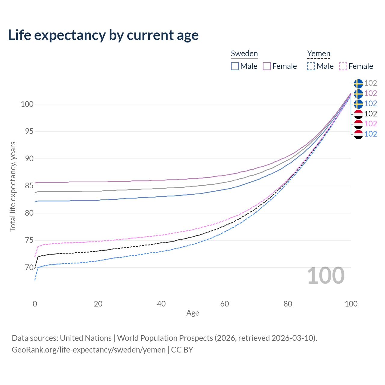 This life expectancy calculator shows the odds of living to 100, 95, 90, and below based on current age for both males and females in Sweden and Yemen, along with mean and median age of death. The calculations are based on the 2026 life tables (actuarial tables) from the UN World Population Prospects.