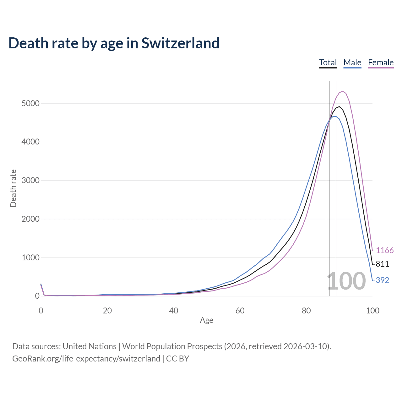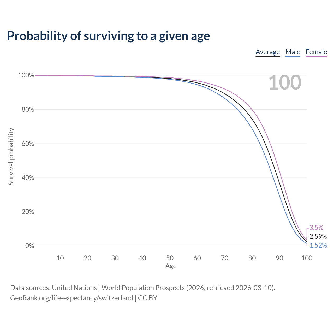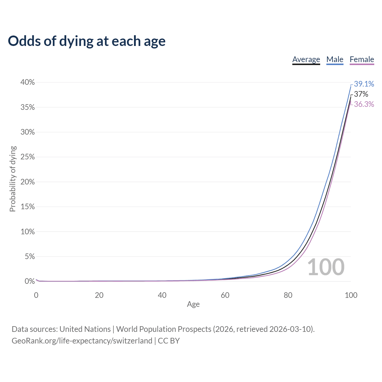 This life expectancy calculator shows the odds of living to 100, 95, 90, and below based on current age for both males and females in Switzerland, along with mean and median age of death. The calculations are based on the 2026 life tables (actuarial tables) from the UN World Population Prospects.