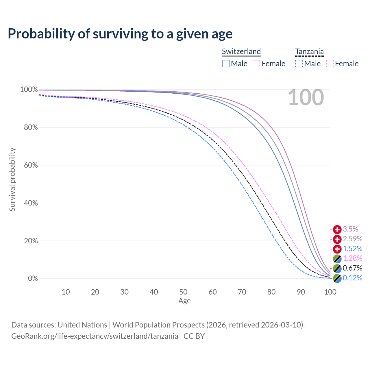 This life expectancy calculator shows the odds of living to 100, 95, 90, and below based on current age for both males and females in Switzerland and Tanzania, along with mean and median age of death. The calculations are based on the 2026 life tables (actuarial tables) from the UN World Population Prospects.