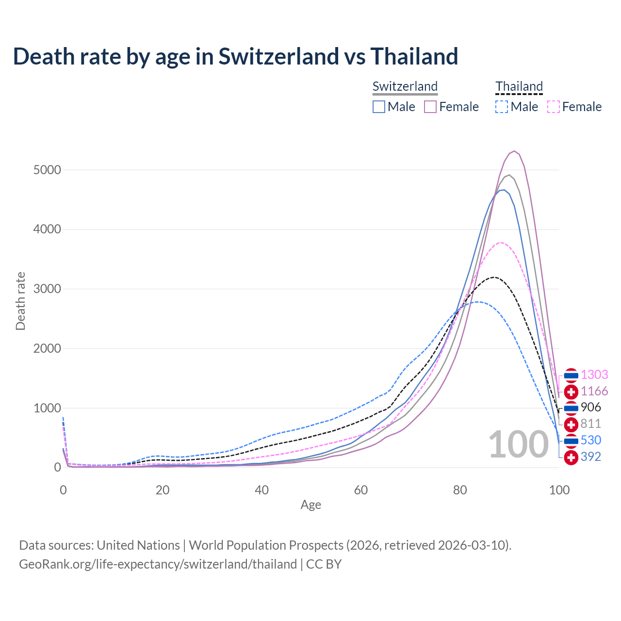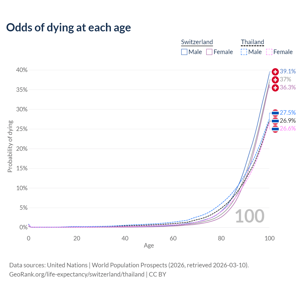This life expectancy calculator shows the odds of living to 100, 95, 90, and below based on current age for both males and females in Switzerland and Thailand, along with mean and median age of death. The calculations are based on the 2026 life tables (actuarial tables) from the UN World Population Prospects.
