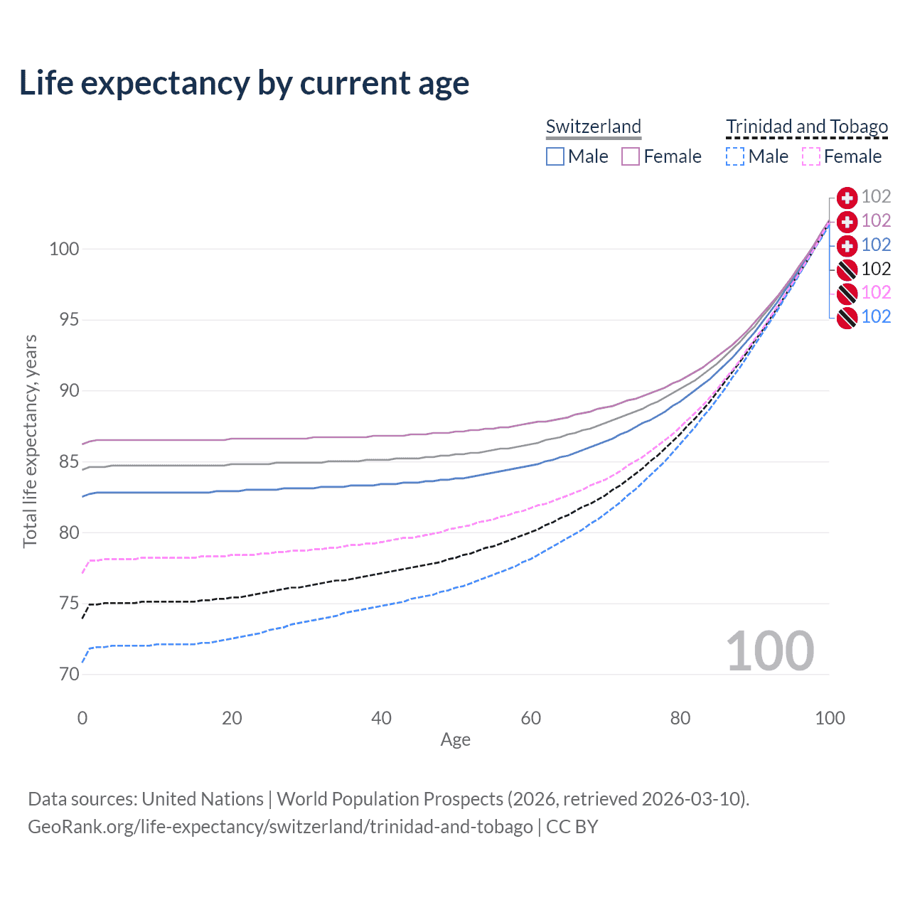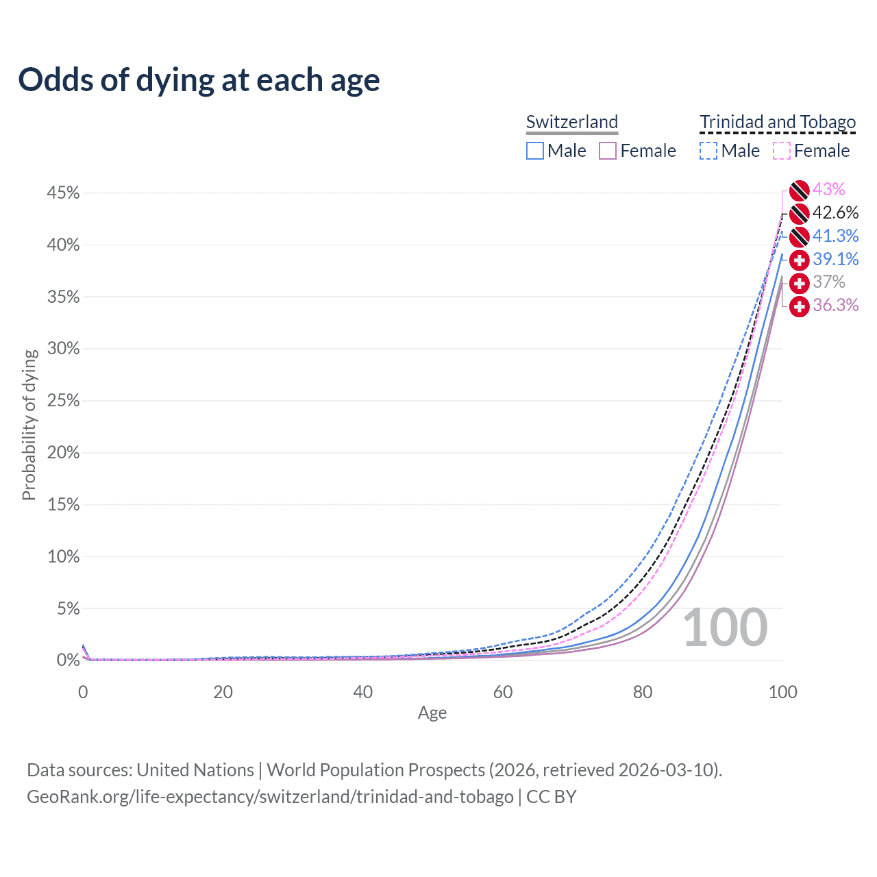 This life expectancy calculator shows the odds of living to 100, 95, 90, and below based on current age for both males and females in Switzerland and Trinidad and Tobago, along with mean and median age of death. The calculations are based on the 2026 life tables (actuarial tables) from the UN World Population Prospects.