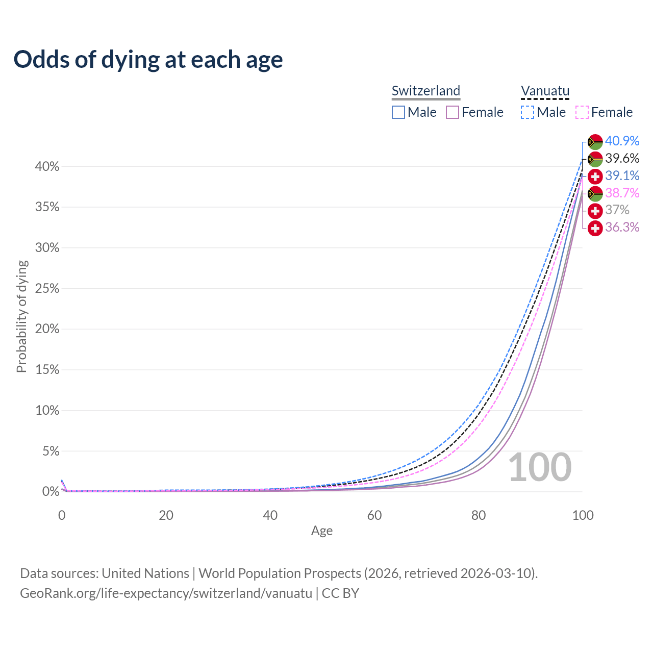 This life expectancy calculator shows the odds of living to 100, 95, 90, and below based on current age for both males and females in Switzerland and Vanuatu, along with mean and median age of death. The calculations are based on the 2026 life tables (actuarial tables) from the UN World Population Prospects.
