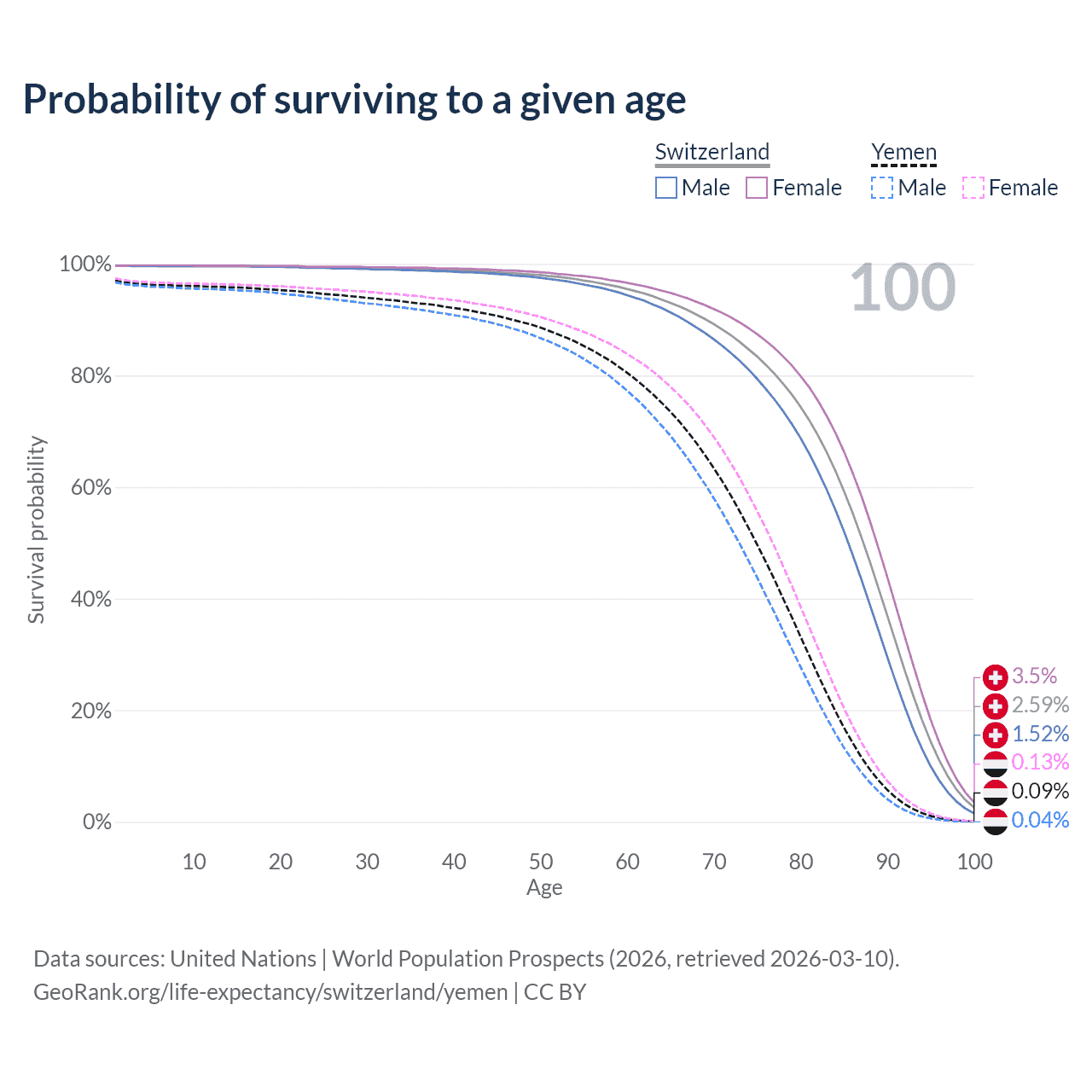 This life expectancy calculator shows the odds of living to 100, 95, 90, and below based on current age for both males and females in Switzerland and Yemen, along with mean and median age of death. The calculations are based on the 2026 life tables (actuarial tables) from the UN World Population Prospects.
