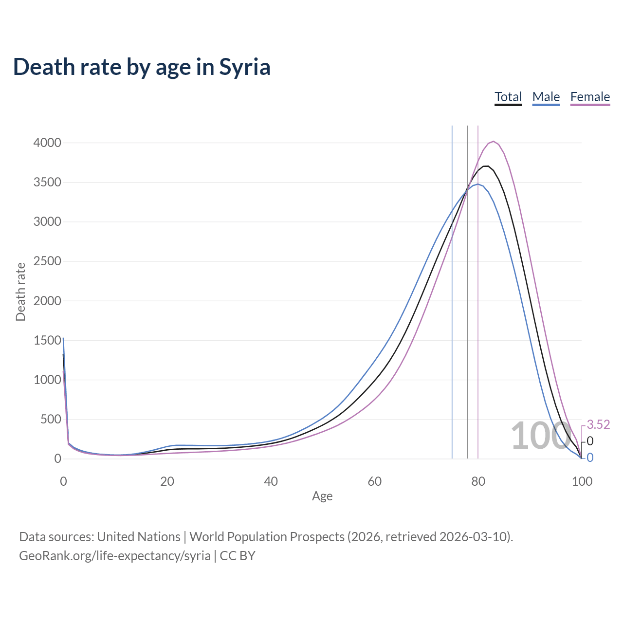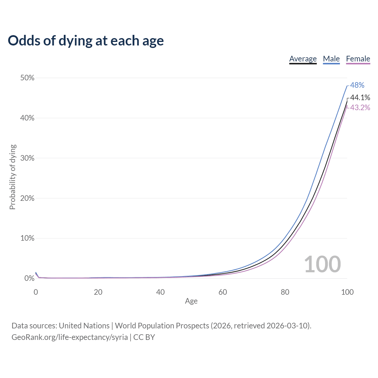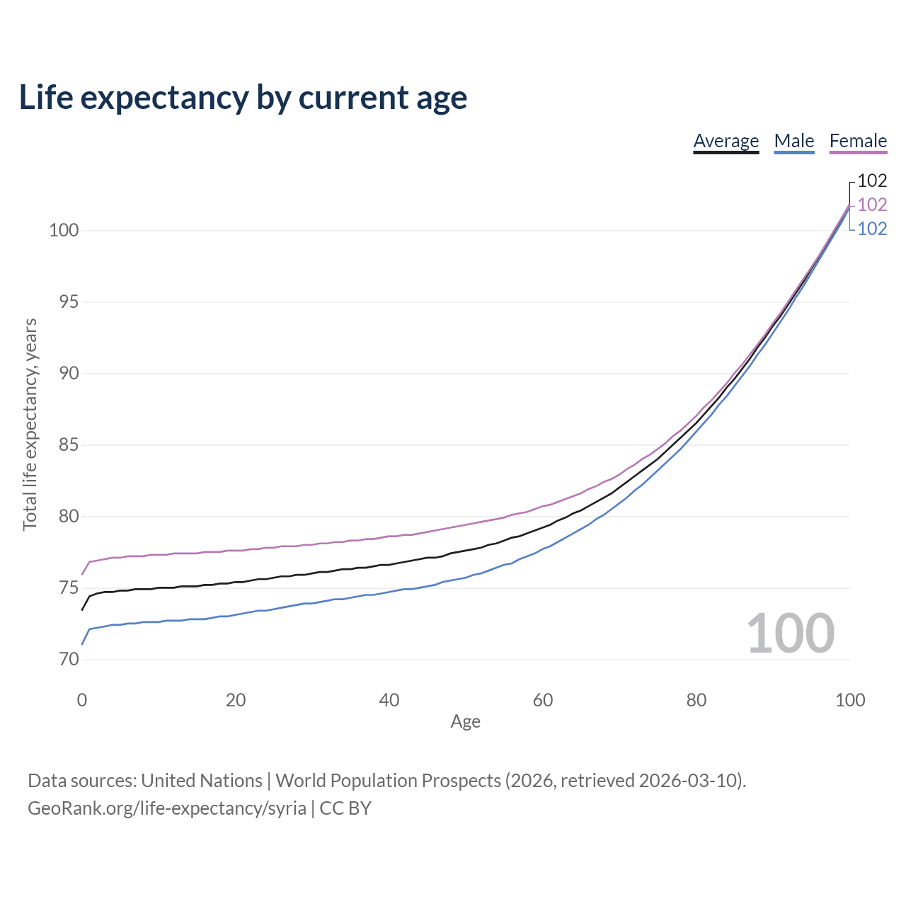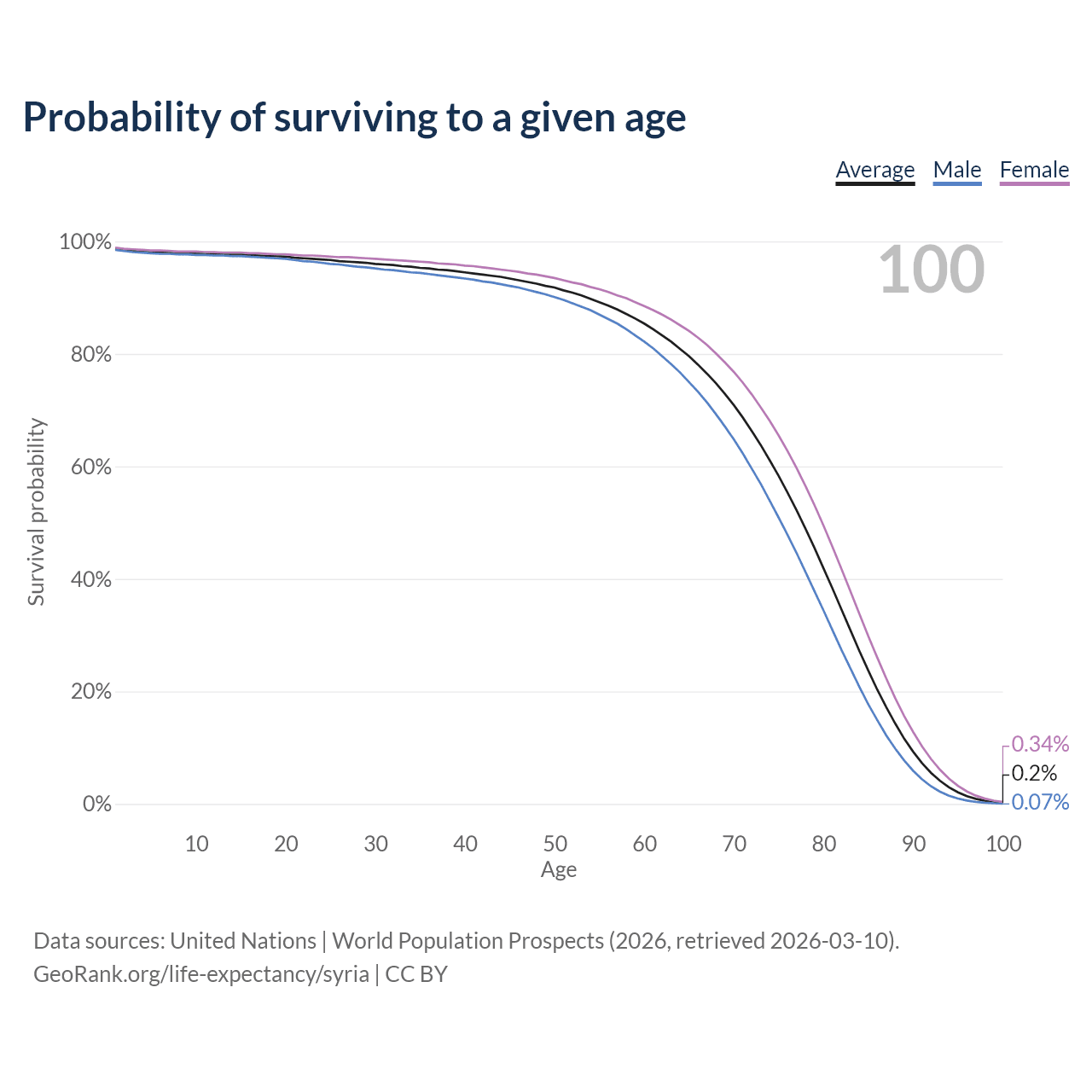 This life expectancy calculator shows the odds of living to 100, 95, 90, and below based on current age for both males and females in Syria, along with mean and median age of death. The calculations are based on the 2026 life tables (actuarial tables) from the UN World Population Prospects.