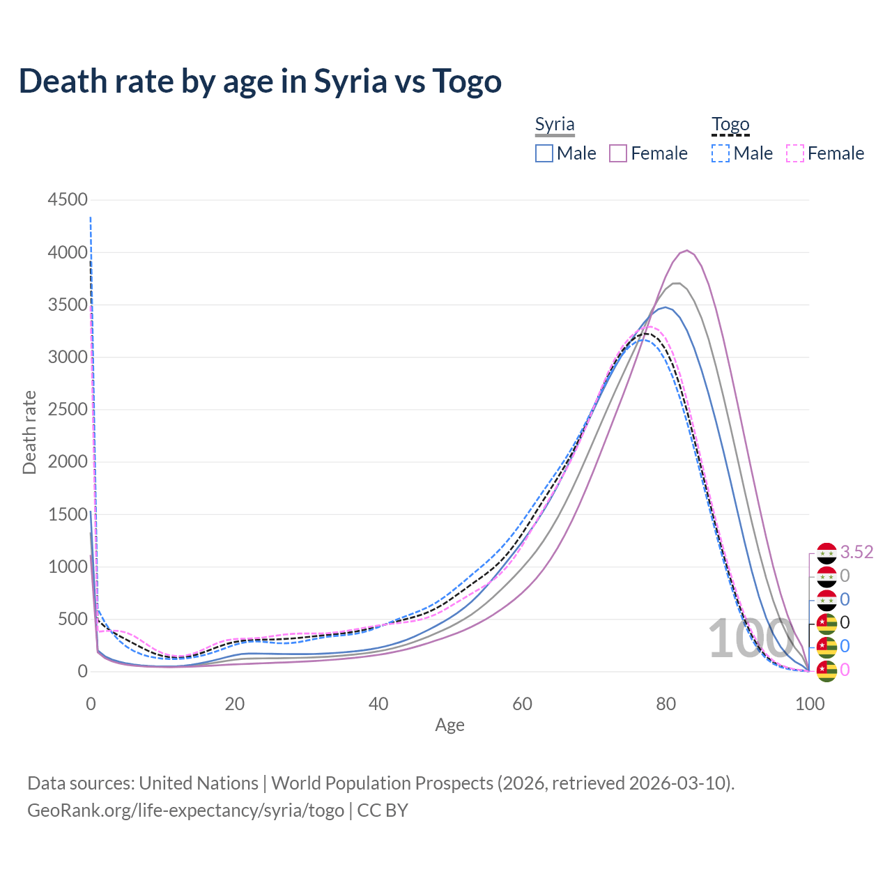 In Syria, the most common age of death is 82, compared to 0 in Togo. The median age of death is 77.7 in Syria and 71 in Togo, meaning only half of each cohort is expected to live past that age.