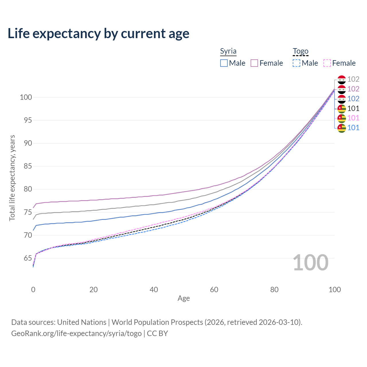 This life expectancy calculator shows the odds of living to 100, 95, 90, and below based on current age for both males and females in Syria and Togo, along with mean and median age of death. The calculations are based on the 2026 life tables (actuarial tables) from the UN World Population Prospects.