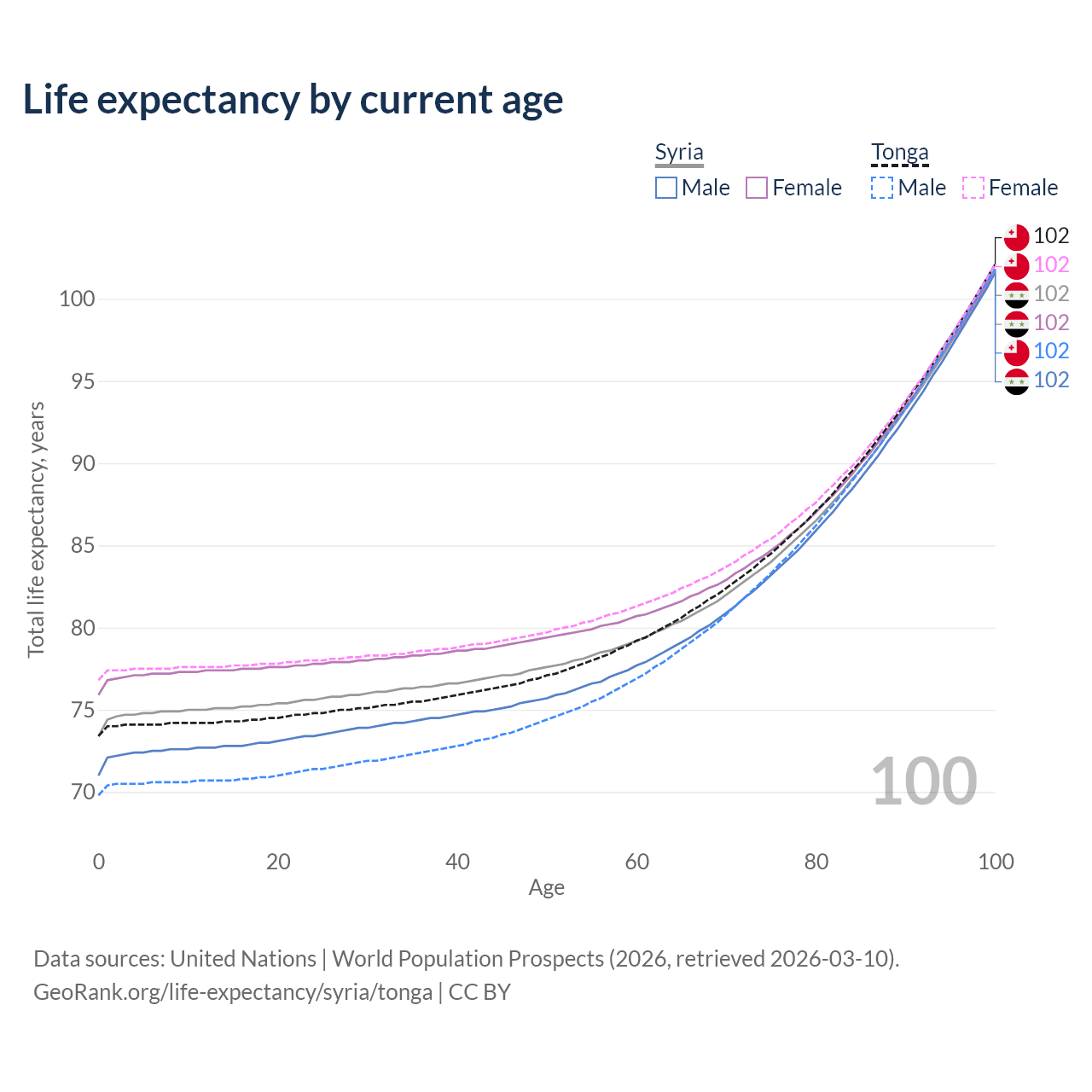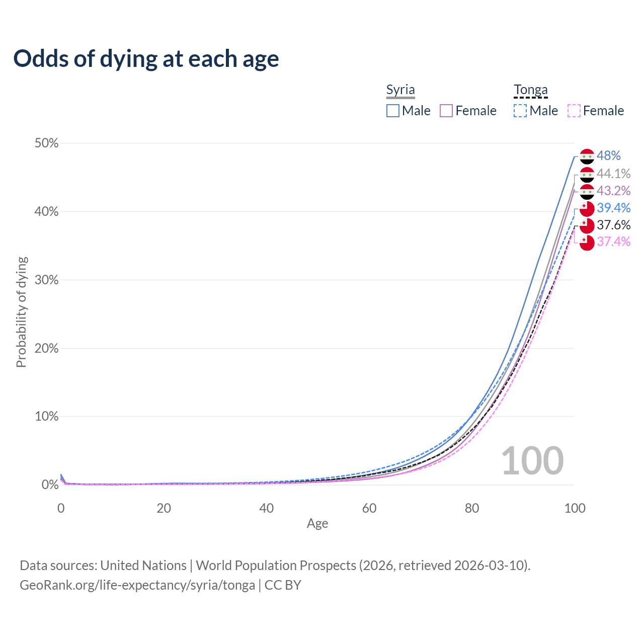 This life expectancy calculator shows the odds of living to 100, 95, 90, and below based on current age for both males and females in Syria and Tonga, along with mean and median age of death. The calculations are based on the 2026 life tables (actuarial tables) from the UN World Population Prospects.