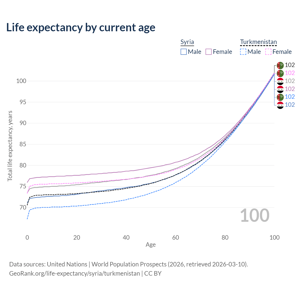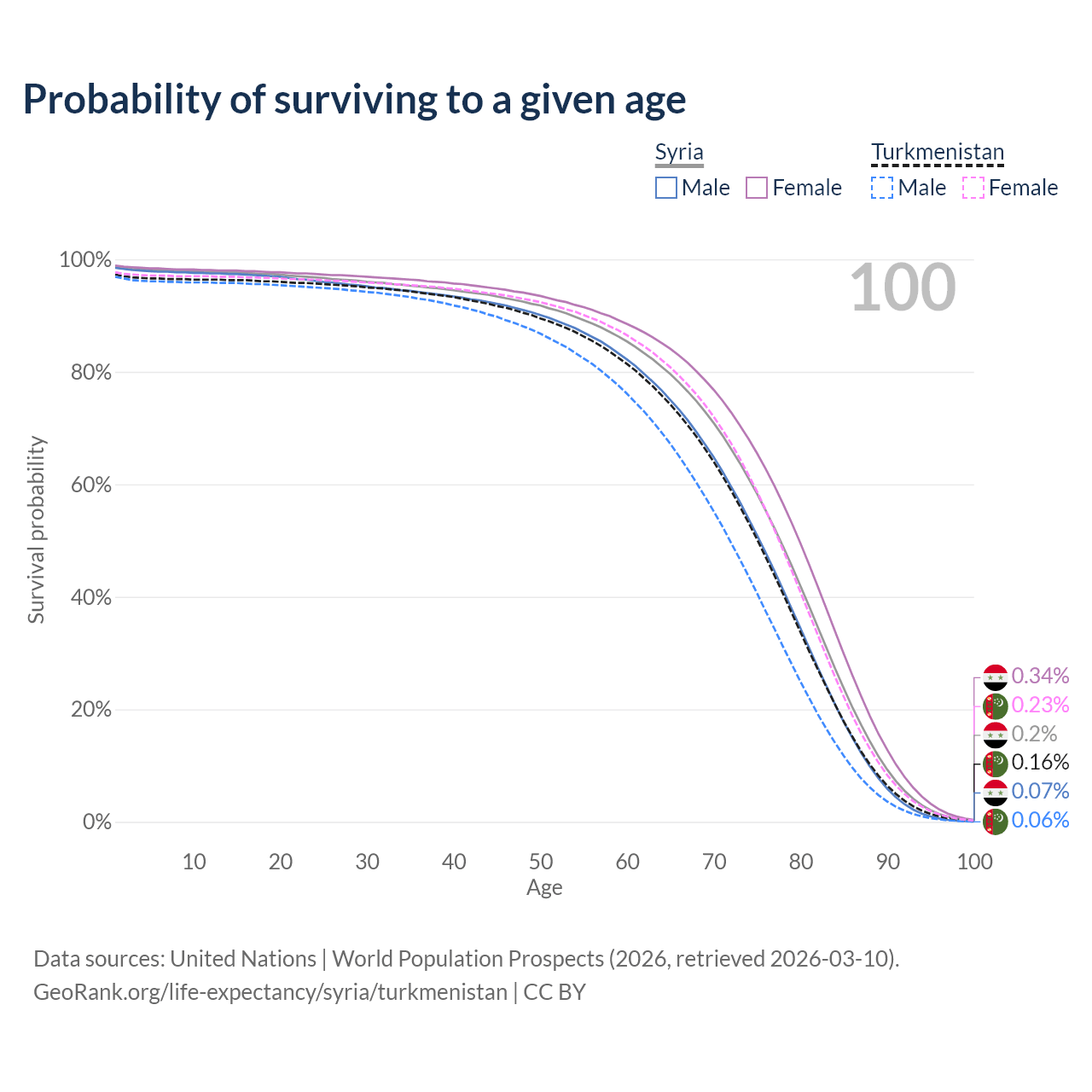 This life expectancy calculator shows the odds of living to 100, 95, 90, and below based on current age for both males and females in Syria and Turkmenistan, along with mean and median age of death. The calculations are based on the 2026 life tables (actuarial tables) from the UN World Population Prospects.
