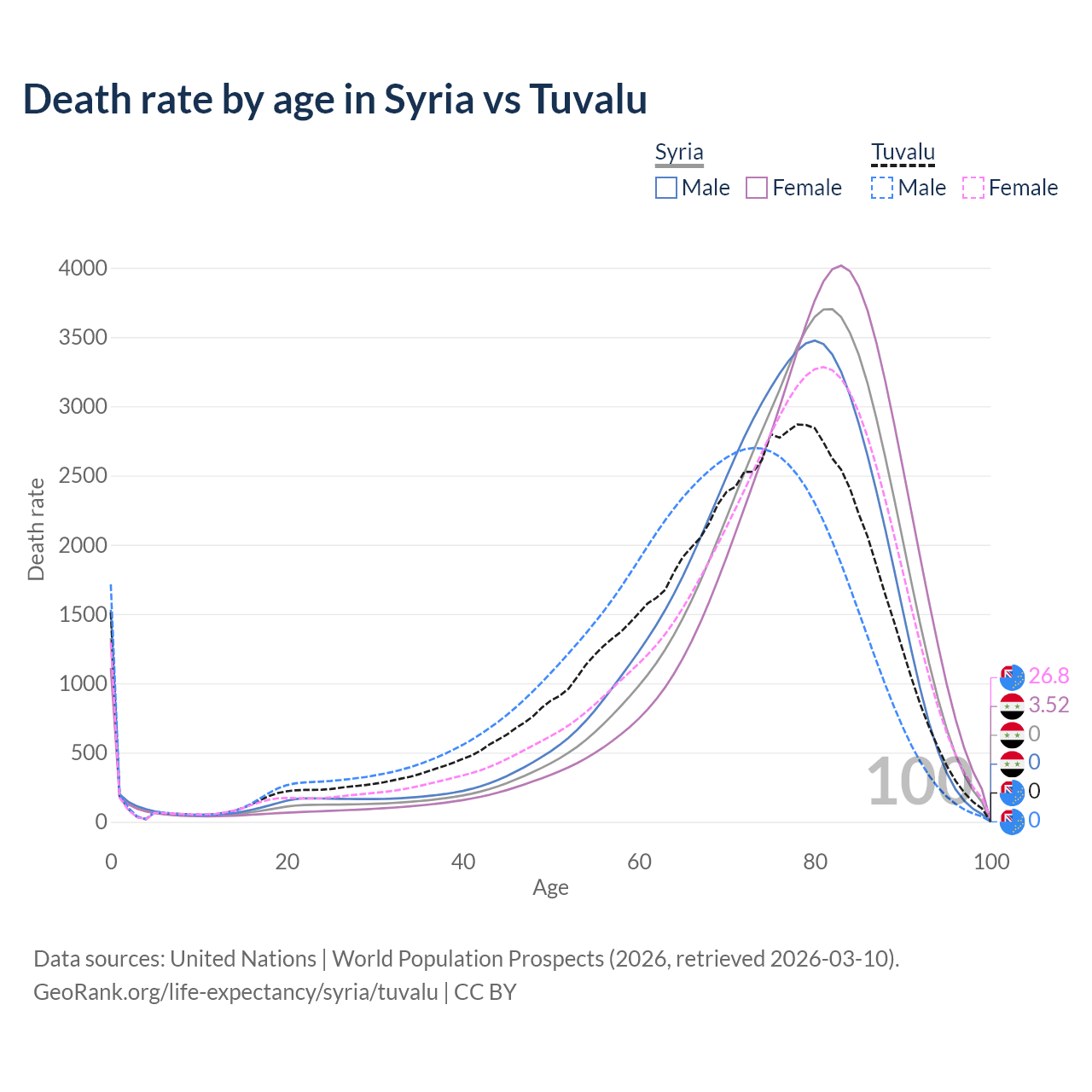 This life expectancy calculator shows the odds of living to 100, 95, 90, and below based on current age for both males and females in Syria and Tuvalu, along with mean and median age of death. The calculations are based on the 2026 life tables (actuarial tables) from the UN World Population Prospects.