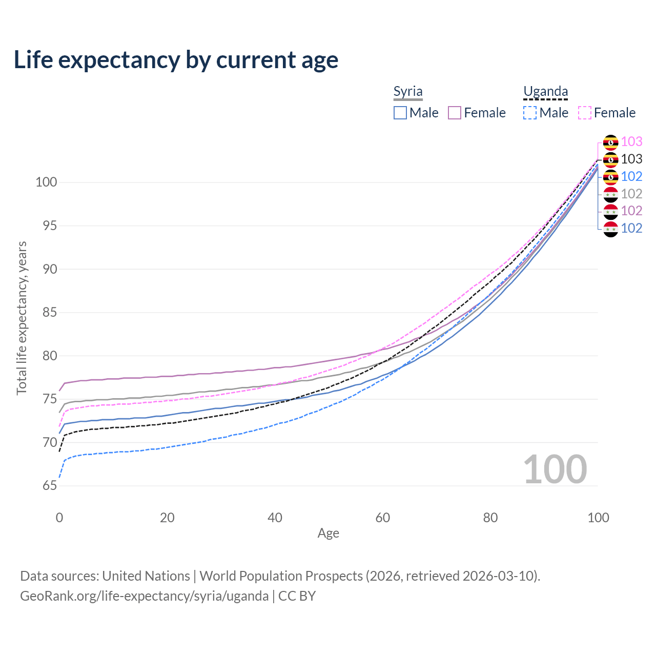 This life expectancy calculator shows the odds of living to 100, 95, 90, and below based on current age for both males and females in Syria and Uganda, along with mean and median age of death. The calculations are based on the 2026 life tables (actuarial tables) from the UN World Population Prospects.