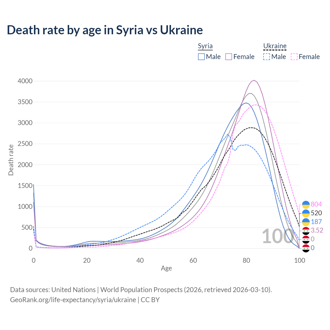 In Syria, the most common age of death is 82, compared to 82 in Ukraine. The median age of death is 77.7 in Syria and 78 in Ukraine, meaning only half of each cohort is expected to live past that age.