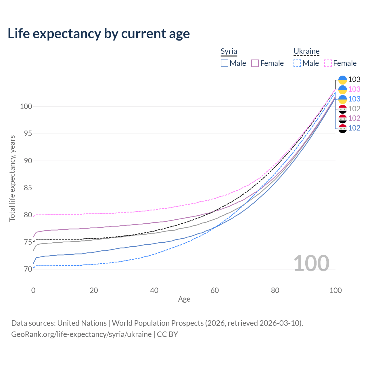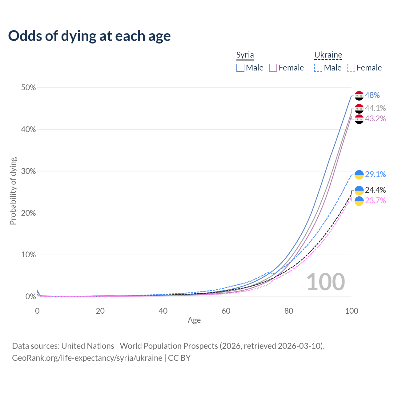 This life expectancy calculator shows the odds of living to 100, 95, 90, and below based on current age for both males and females in Syria and Ukraine, along with mean and median age of death. The calculations are based on the 2026 life tables (actuarial tables) from the UN World Population Prospects.