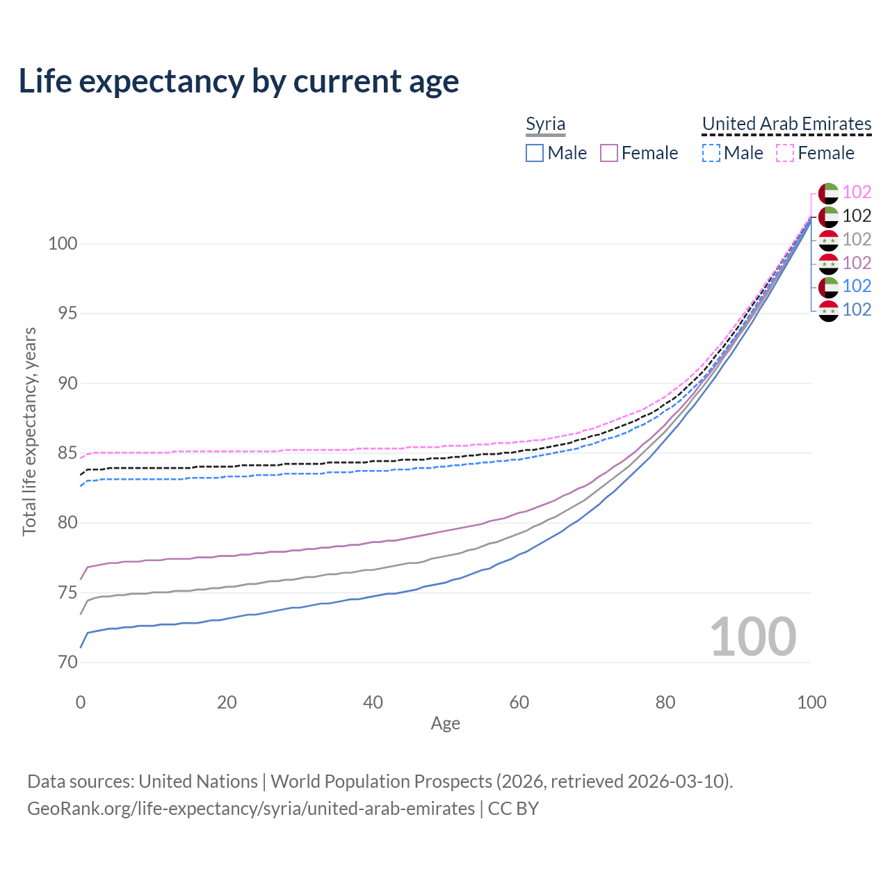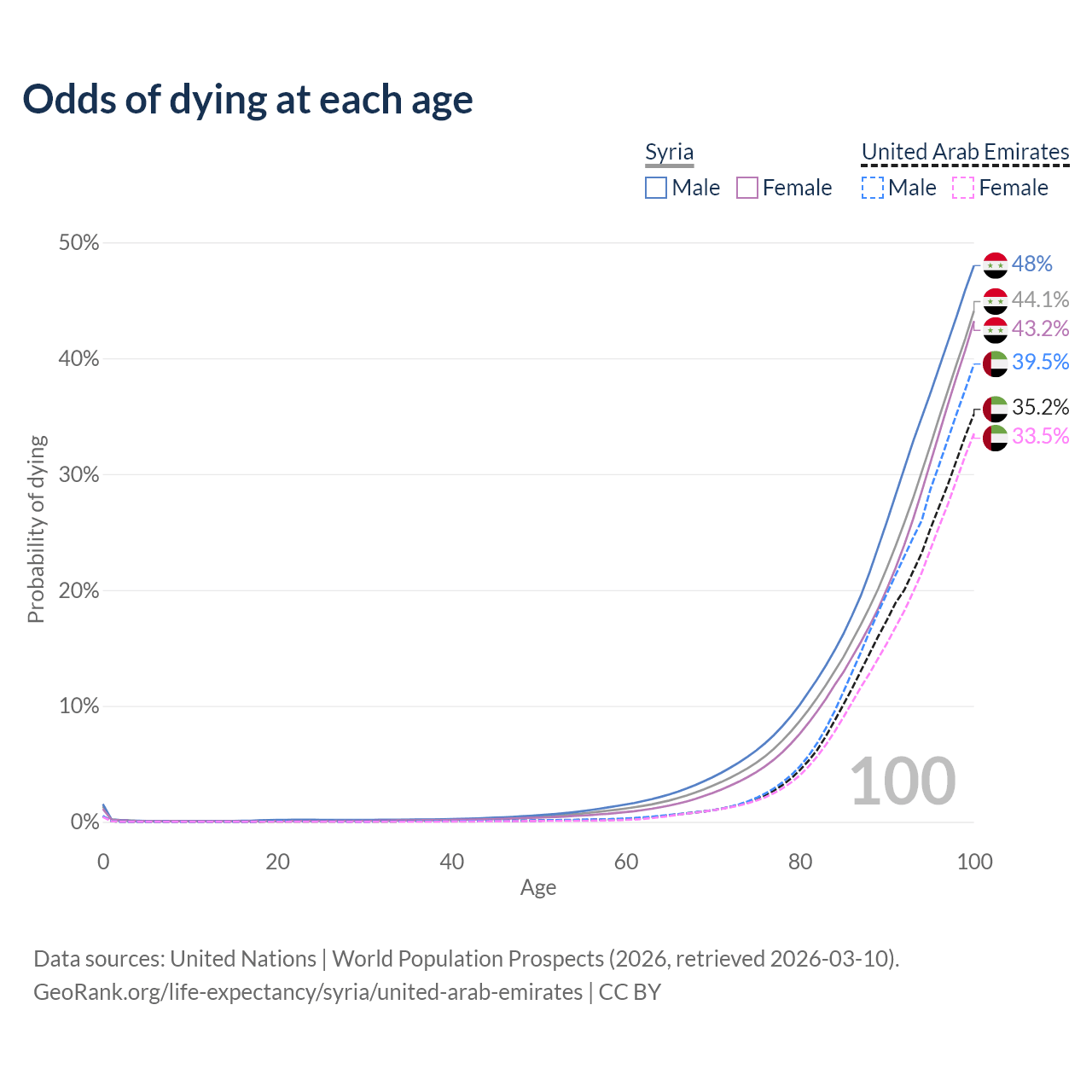 This life expectancy calculator shows the odds of living to 100, 95, 90, and below based on current age for both males and females in Syria and the United Arab Emirates, along with mean and median age of death. The calculations are based on the 2026 life tables (actuarial tables) from the UN World Population Prospects.