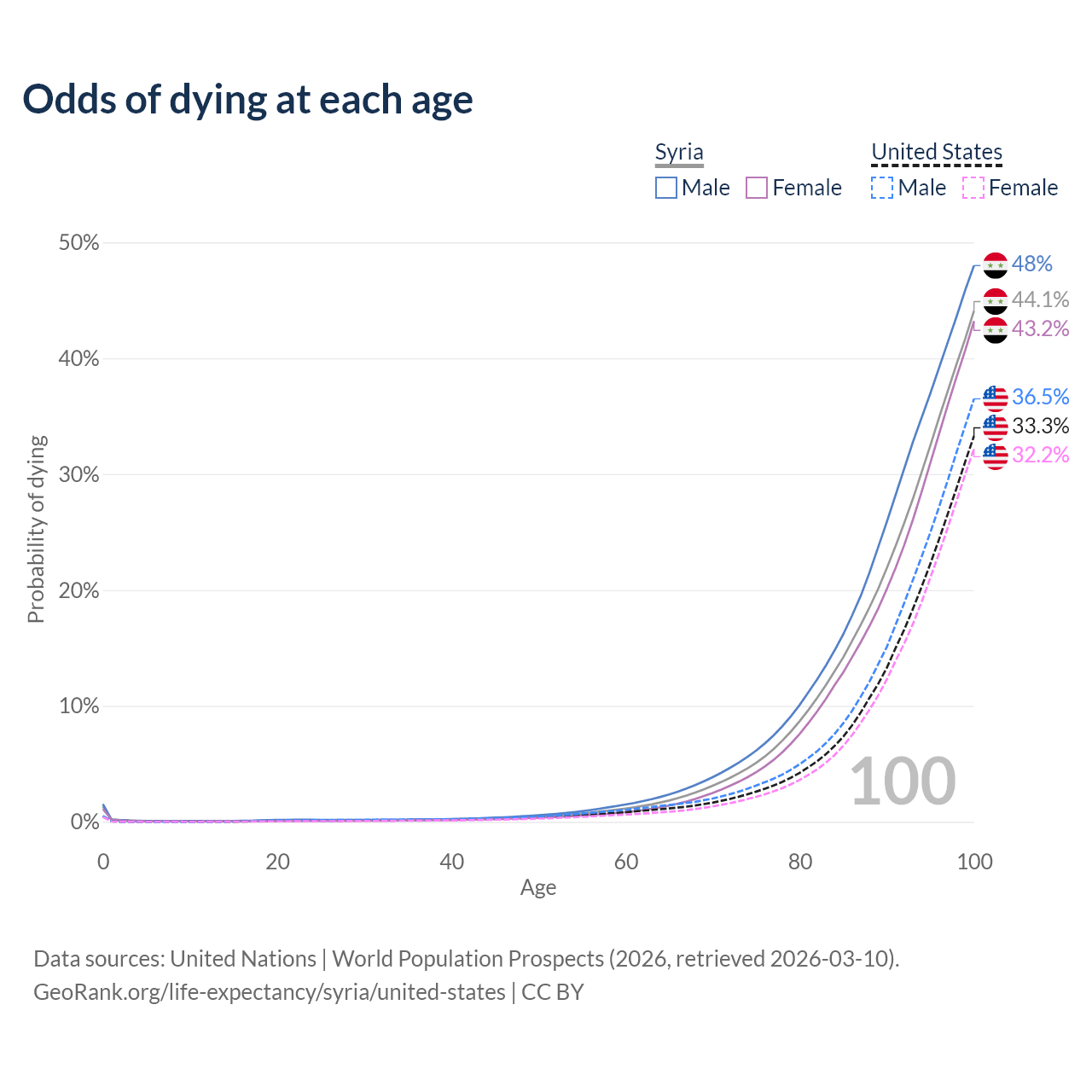 This life expectancy calculator shows the odds of living to 100, 95, 90, and below based on current age for both males and females in Syria and the United States, along with mean and median age of death. The calculations are based on the 2026 life tables (actuarial tables) from the UN World Population Prospects.
