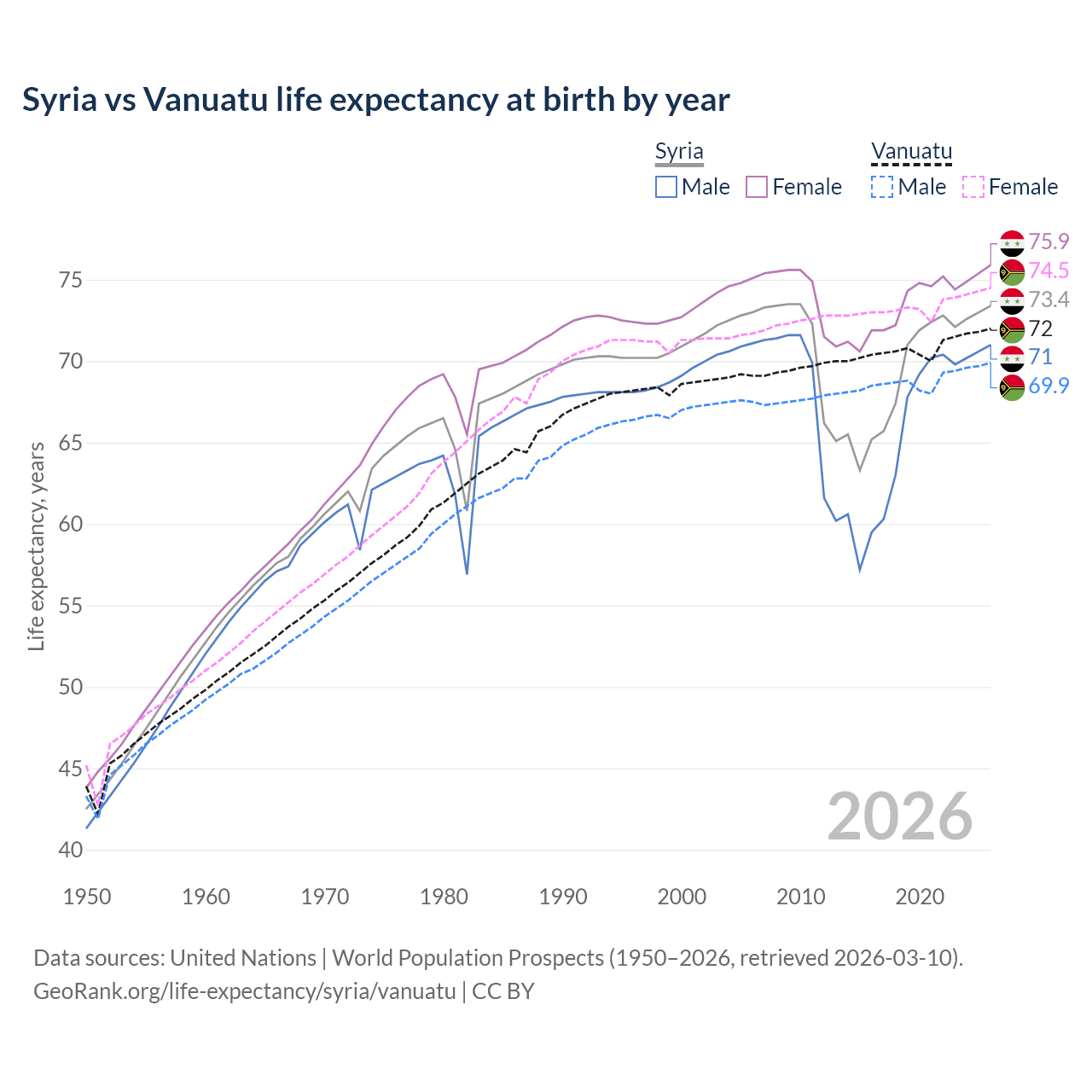 The average life expectancy at birth is 73.4 years in Syria vs 72 in Vanuatu. Syria is ranked 108/197 by life expectancy, and Vanuatu is 125/197. In Syria, the life expectancy is 71 years for males and 75.9 years for females. In Vanuatu, it's 69.9 years for males and 74.5 years for females.