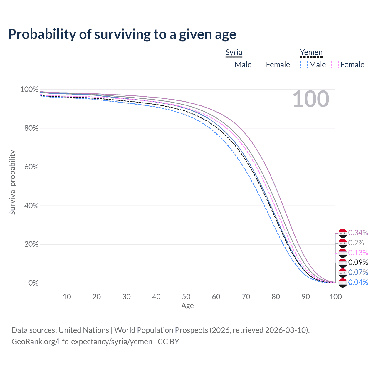 This life expectancy calculator shows the odds of living to 100, 95, 90, and below based on current age for both males and females in Syria and Yemen, along with mean and median age of death. The calculations are based on the 2026 life tables (actuarial tables) from the UN World Population Prospects.
