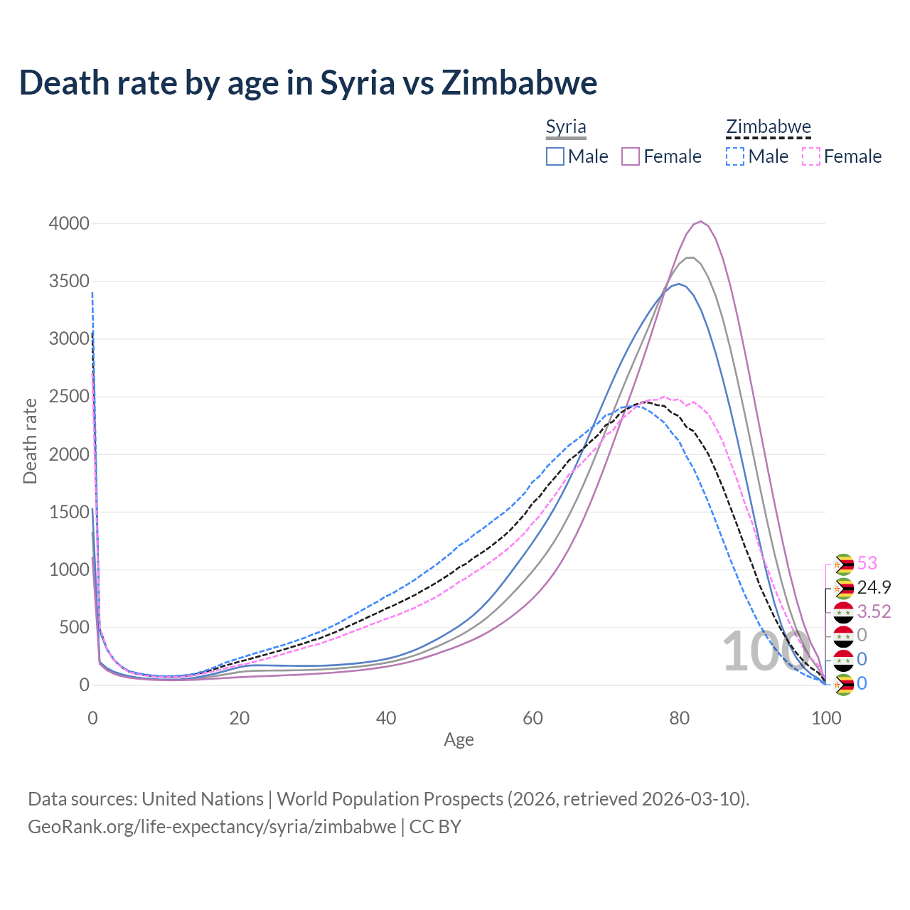 In Syria, the most common age of death is 82, compared to 0 in Zimbabwe. The median age of death is 77.7 in Syria and 68.8 in Zimbabwe, meaning only half of each cohort is expected to live past that age.