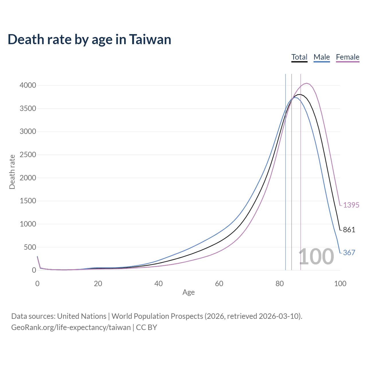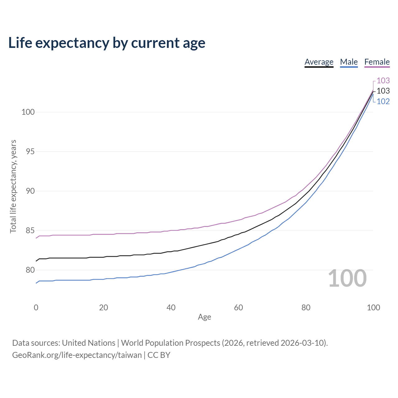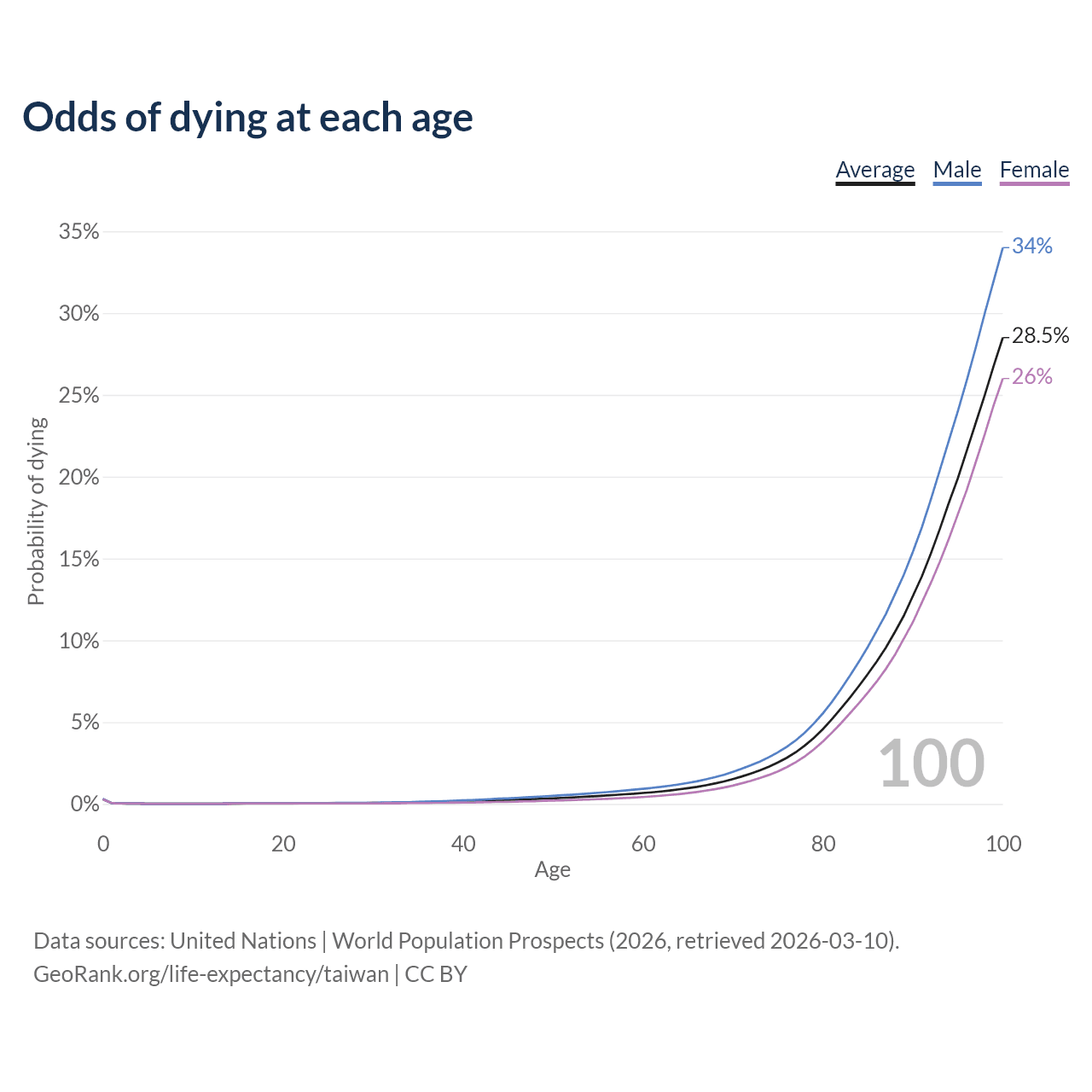 This life expectancy calculator shows the odds of living to 100, 95, 90, and below based on current age for both males and females in Taiwan, along with mean and median age of death. The calculations are based on the 2026 life tables (actuarial tables) from the UN World Population Prospects.