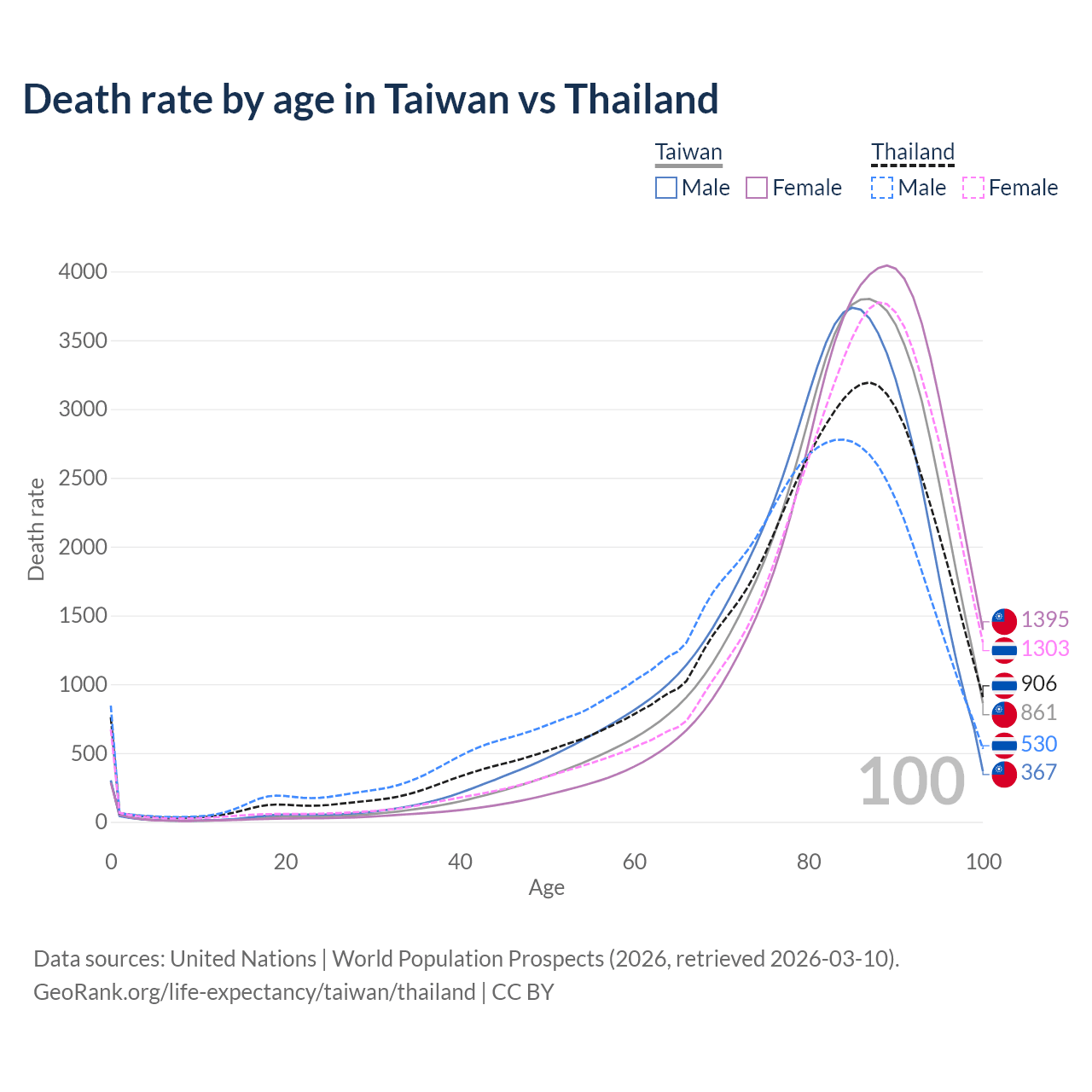 This life expectancy calculator shows the odds of living to 100, 95, 90, and below based on current age for both males and females in Taiwan and Thailand, along with mean and median age of death. The calculations are based on the 2026 life tables (actuarial tables) from the UN World Population Prospects.
