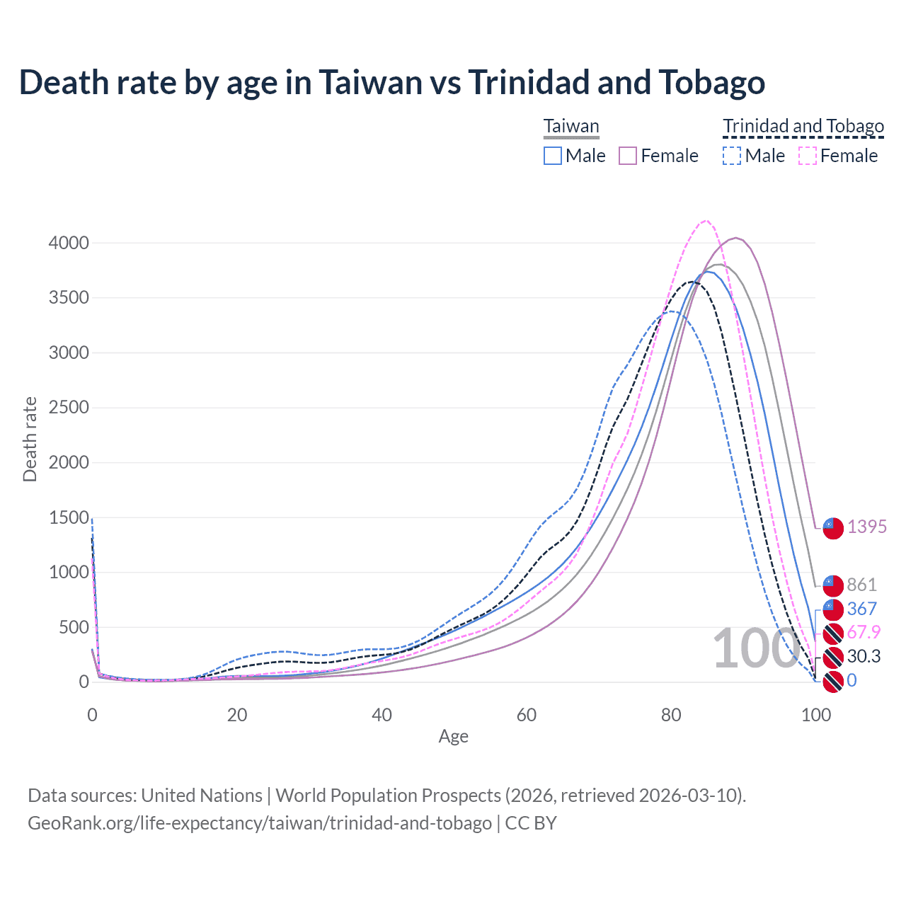 In Taiwan, the most common age of death is 87, compared to 83 in Trinidad and Tobago. The median age of death is 84.3 in Taiwan and 78.4 in Trinidad and Tobago, meaning only half of each cohort is expected to live past that age.