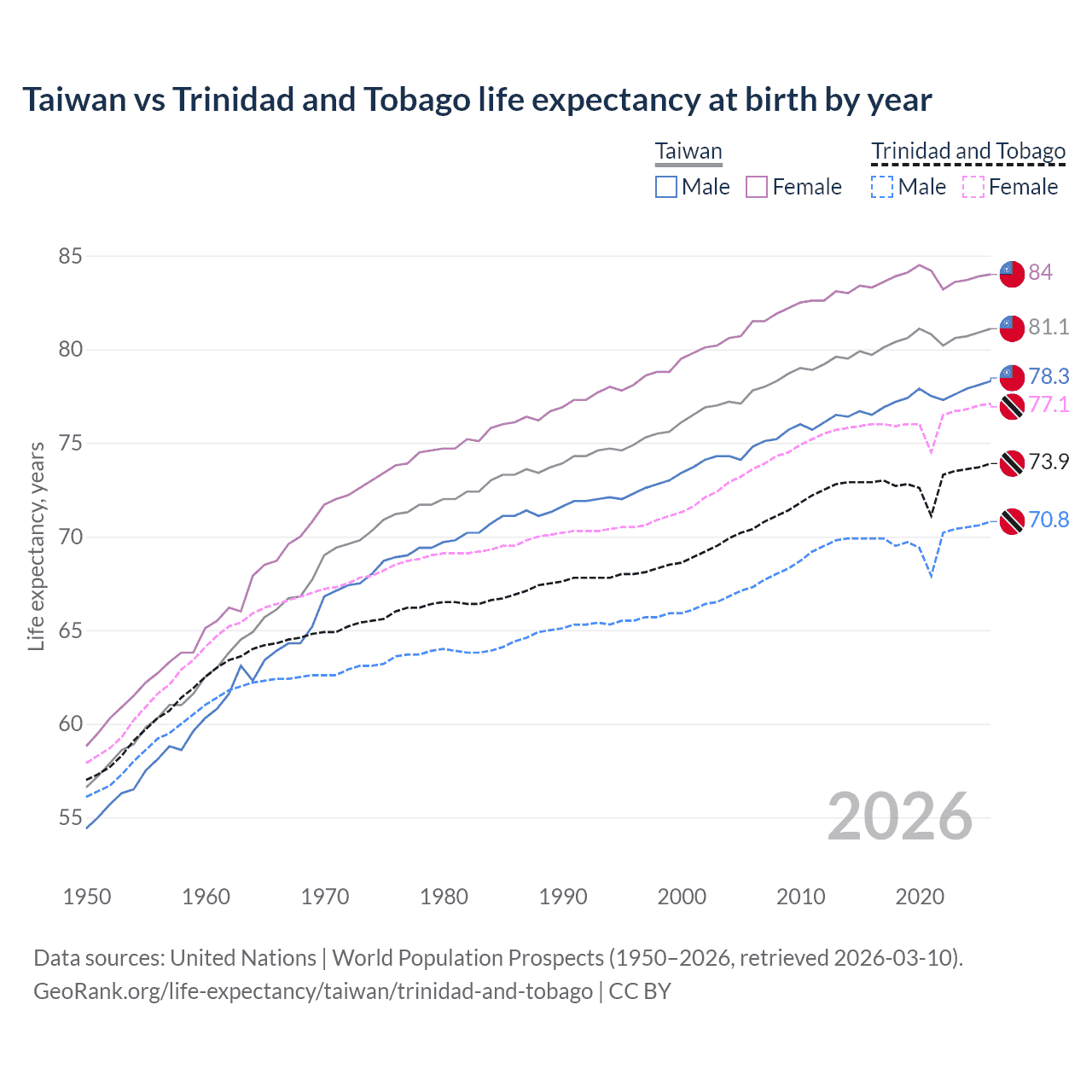 The average life expectancy at birth is 81.1 years in Taiwan vs 73.9 in Trinidad and Tobago. Taiwan is ranked 40/197 by life expectancy, and Trinidad and Tobago is 105/197. In Taiwan, the life expectancy is 78.3 years for males and 84 years for females. In Trinidad and Tobago, it's 70.8 years for males and 77.1 years for females.