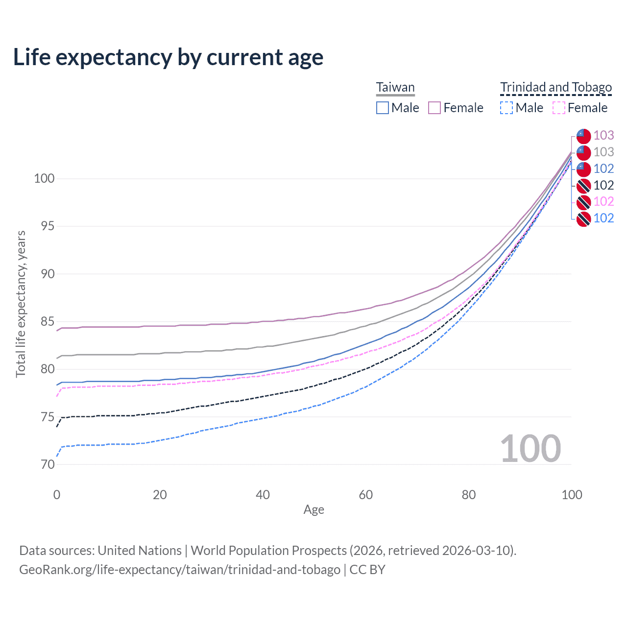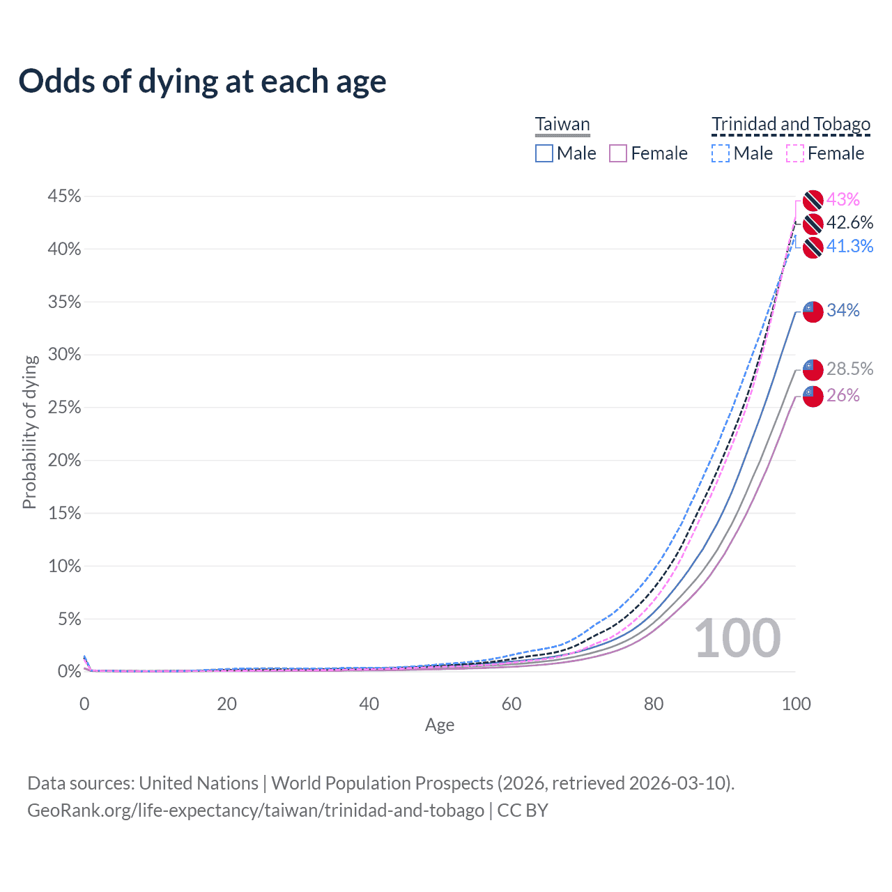 This life expectancy calculator shows the odds of living to 100, 95, 90, and below based on current age for both males and females in Taiwan and Trinidad and Tobago, along with mean and median age of death. The calculations are based on the 2026 life tables (actuarial tables) from the UN World Population Prospects.