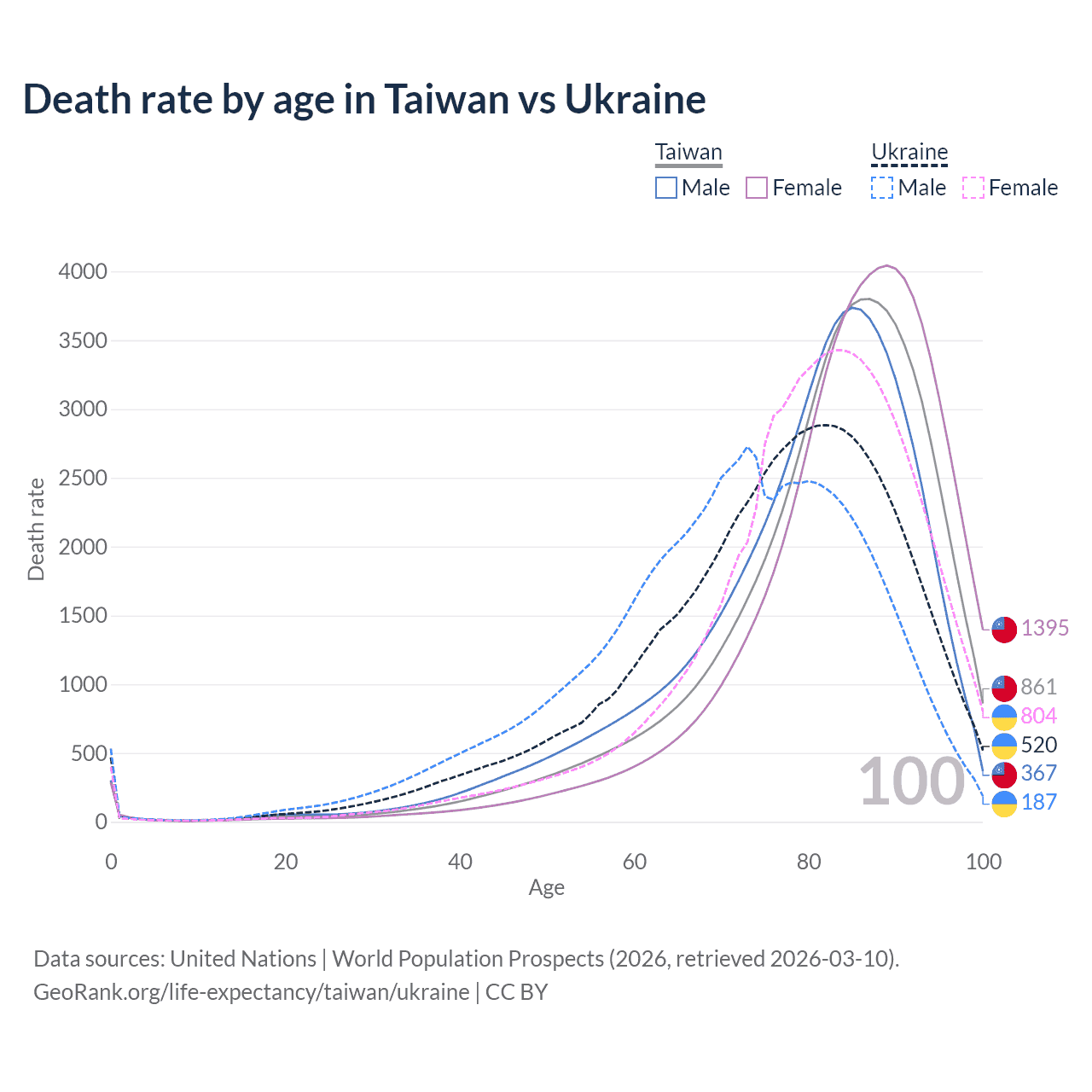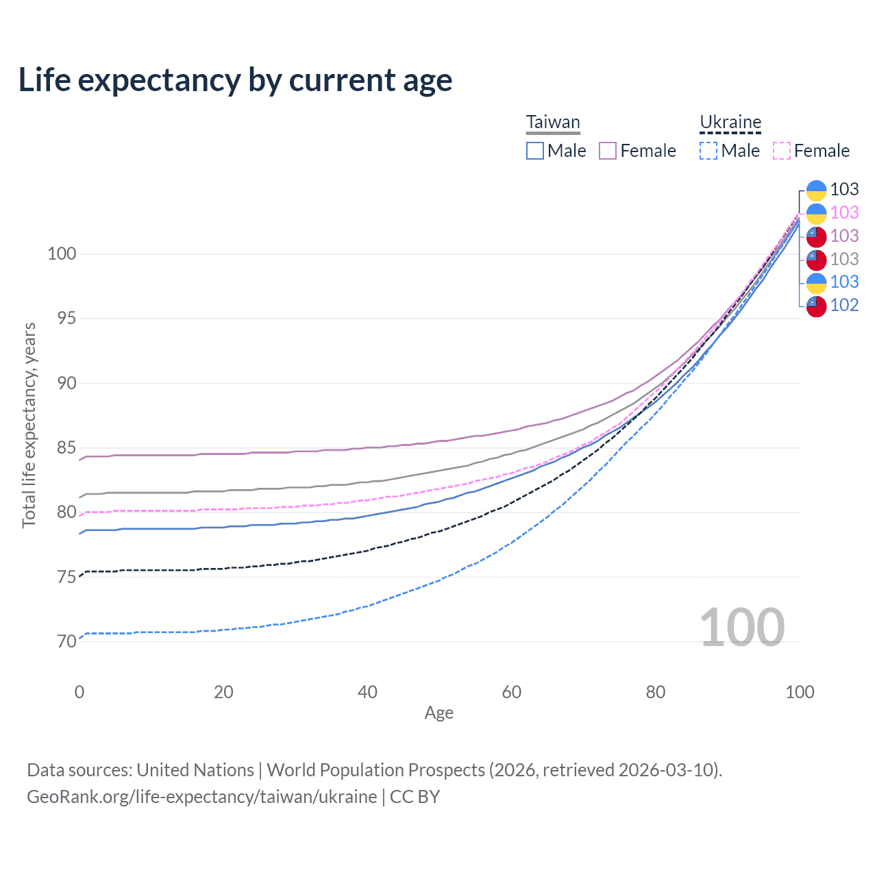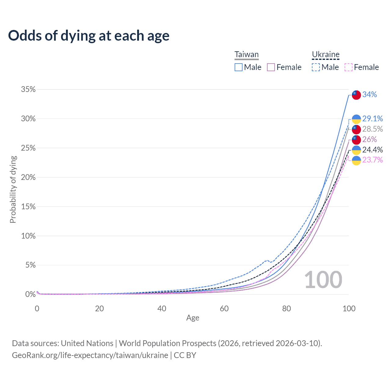 This life expectancy calculator shows the odds of living to 100, 95, 90, and below based on current age for both males and females in Taiwan and Ukraine, along with mean and median age of death. The calculations are based on the 2026 life tables (actuarial tables) from the UN World Population Prospects.