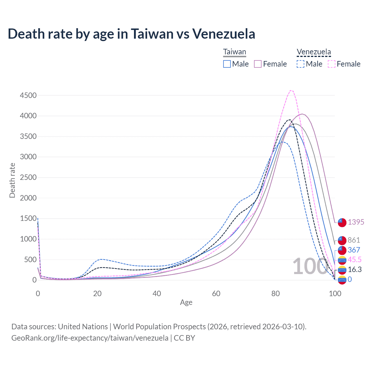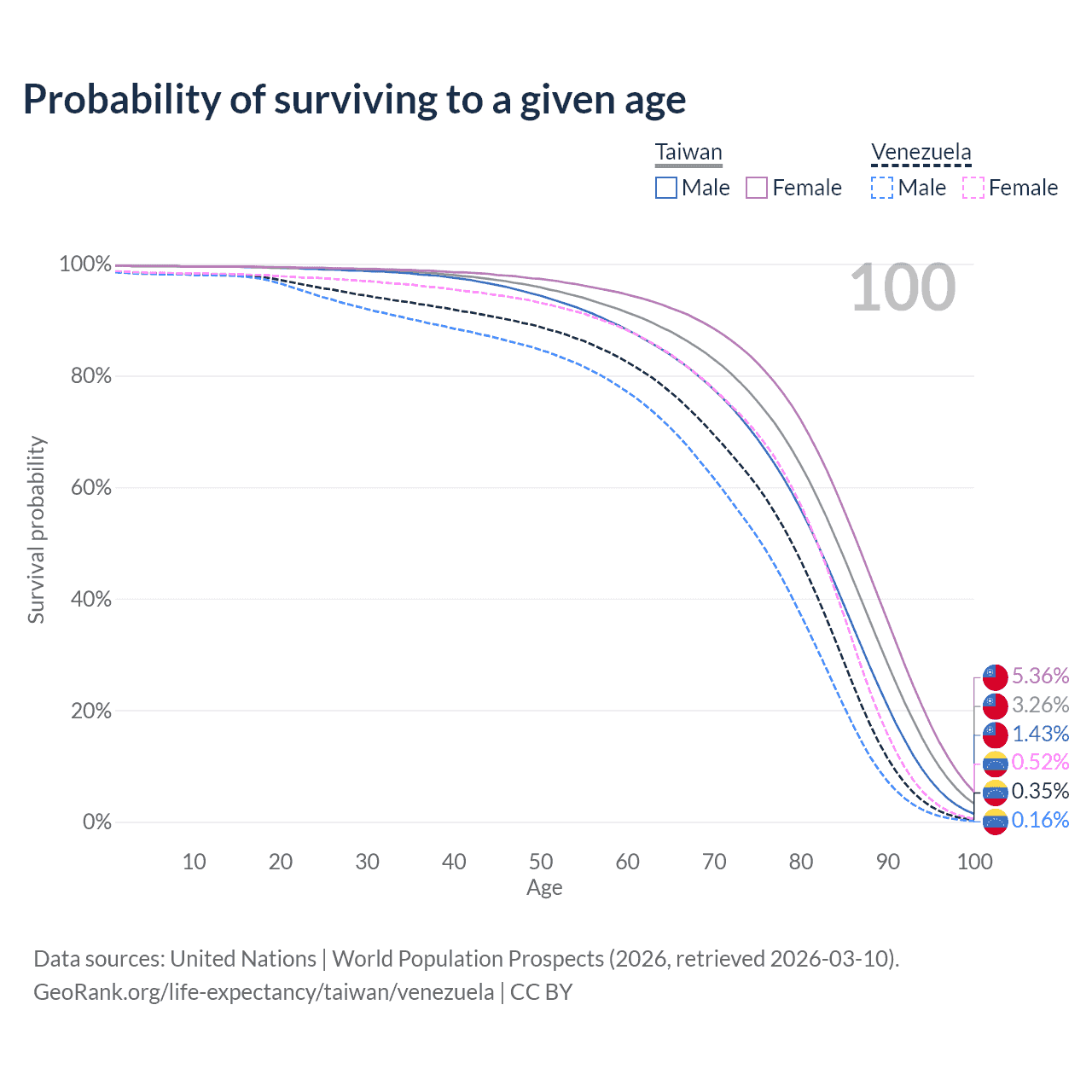 This life expectancy calculator shows the odds of living to 100, 95, 90, and below based on current age for both males and females in Taiwan and Venezuela, along with mean and median age of death. The calculations are based on the 2026 life tables (actuarial tables) from the UN World Population Prospects.