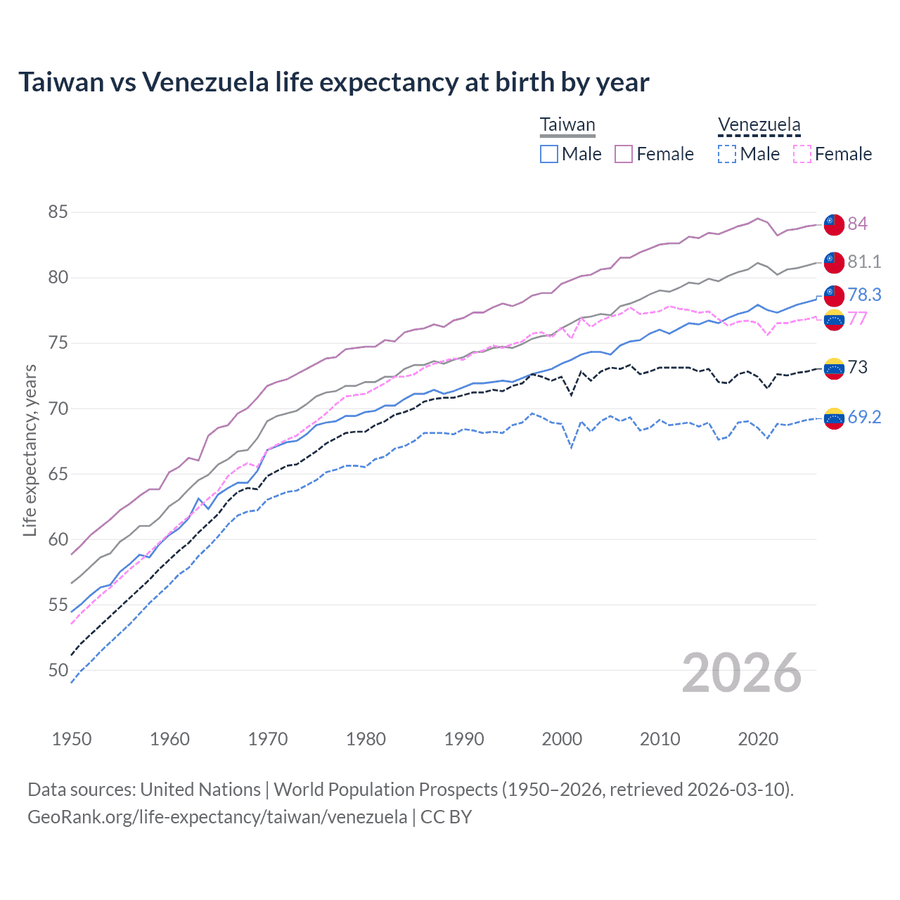 The average life expectancy at birth is 81.1 years in Taiwan vs 73 in Venezuela. Taiwan is ranked 40/197 by life expectancy, and Venezuela is 114/197. In Taiwan, the life expectancy is 78.3 years for males and 84 years for females. In Venezuela, it's 69.2 years for males and 77 years for females.
