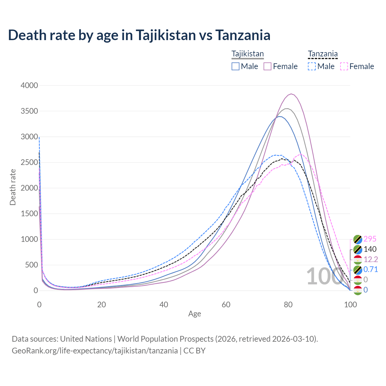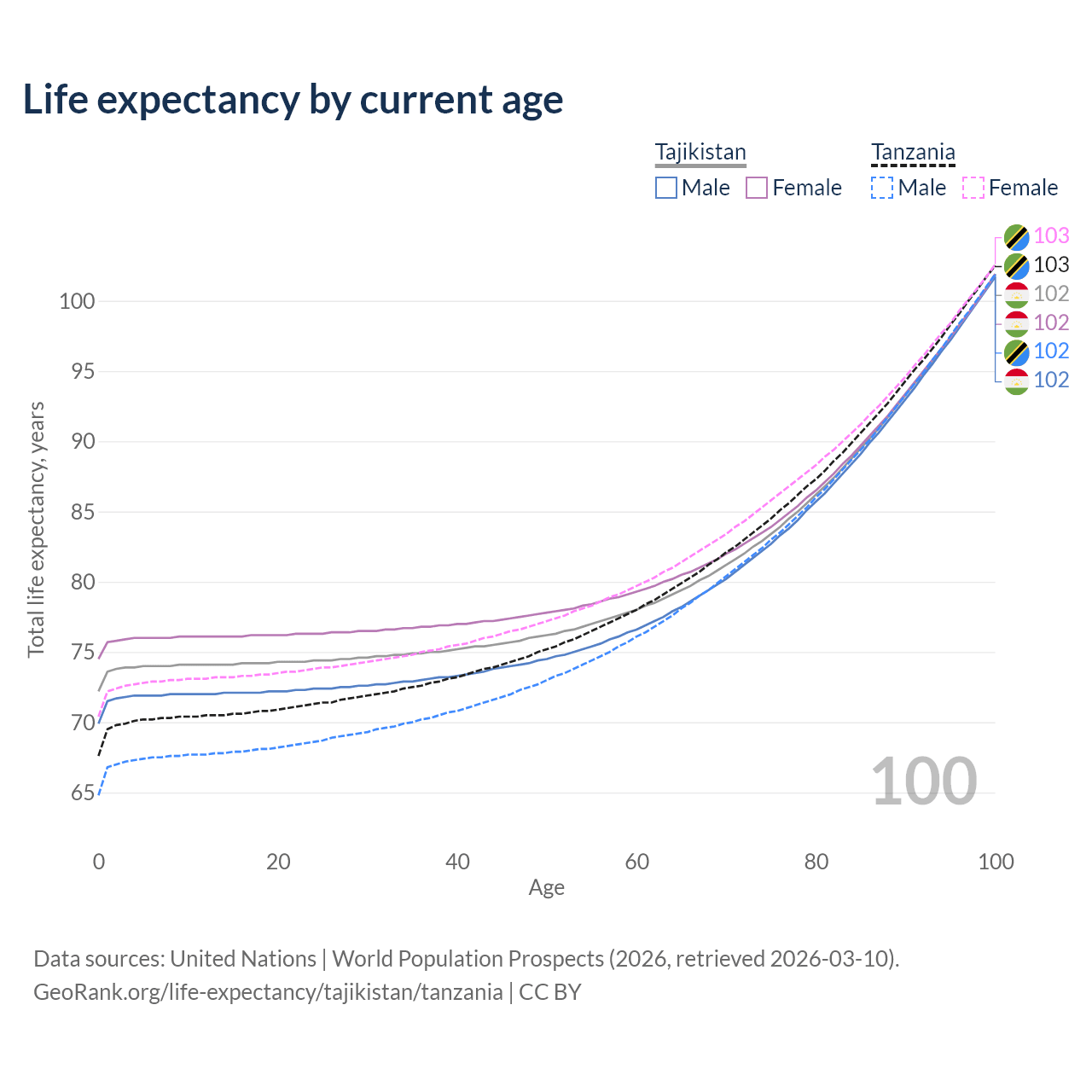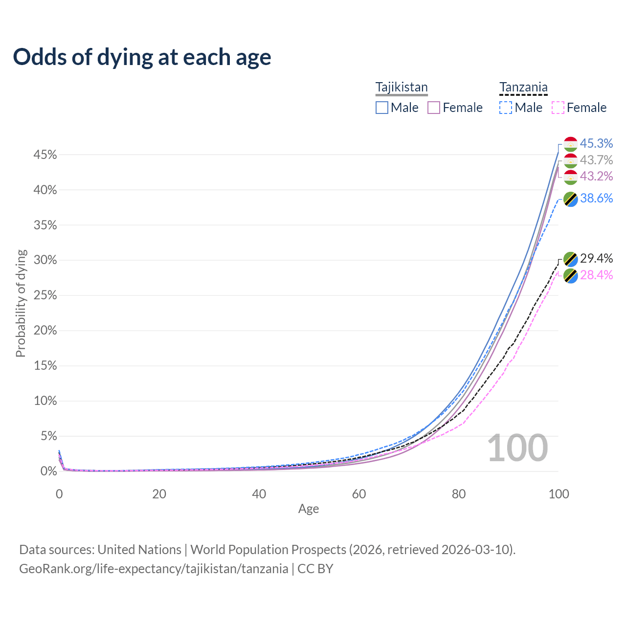 This life expectancy calculator shows the odds of living to 100, 95, 90, and below based on current age for both males and females in Tajikistan and Tanzania, along with mean and median age of death. The calculations are based on the 2026 life tables (actuarial tables) from the UN World Population Prospects.