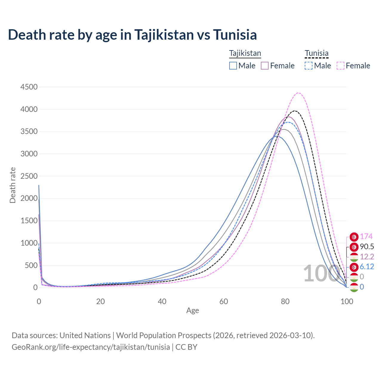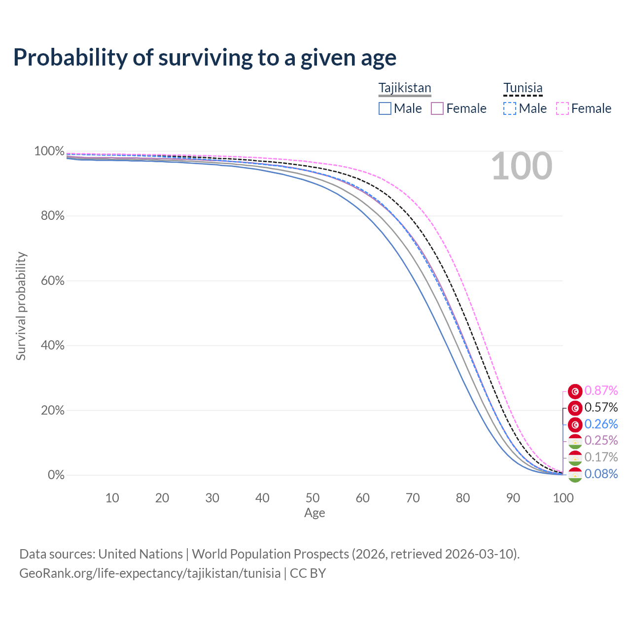 This life expectancy calculator shows the odds of living to 100, 95, 90, and below based on current age for both males and females in Tajikistan and Tunisia, along with mean and median age of death. The calculations are based on the 2026 life tables (actuarial tables) from the UN World Population Prospects.