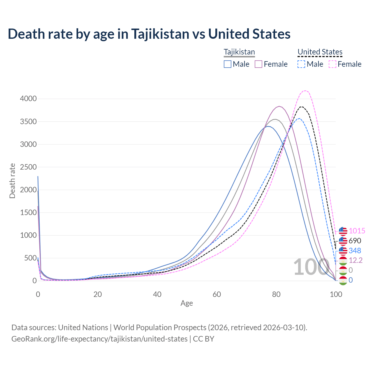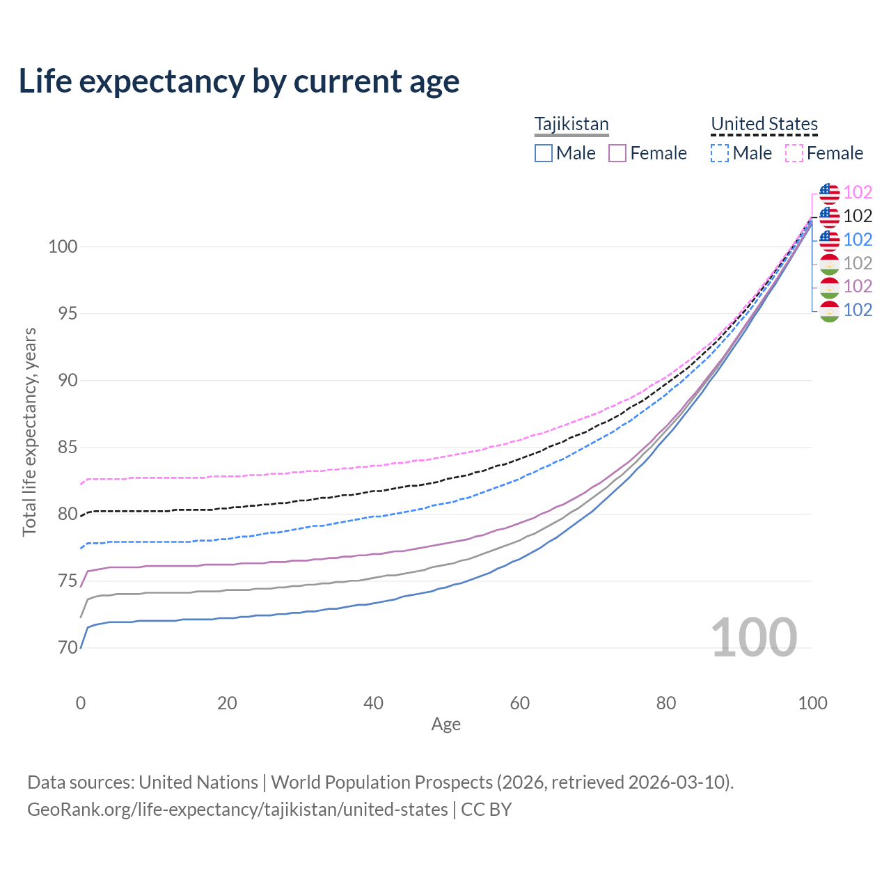 This life expectancy calculator shows the odds of living to 100, 95, 90, and below based on current age for both males and females in Tajikistan and the United States, along with mean and median age of death. The calculations are based on the 2026 life tables (actuarial tables) from the UN World Population Prospects.