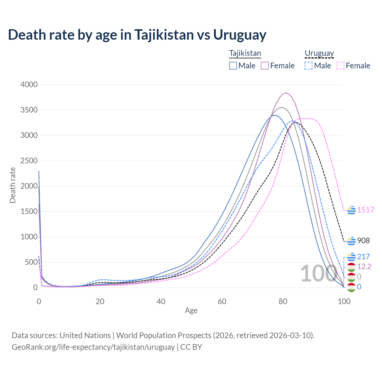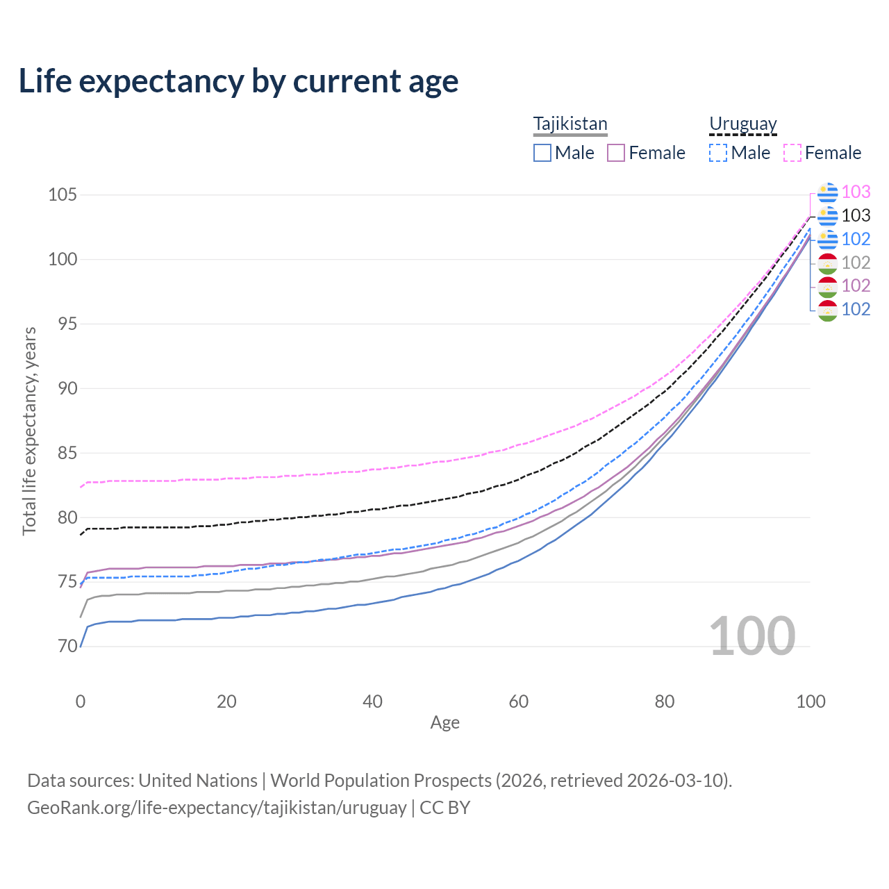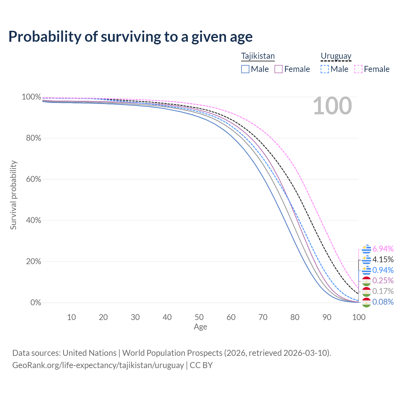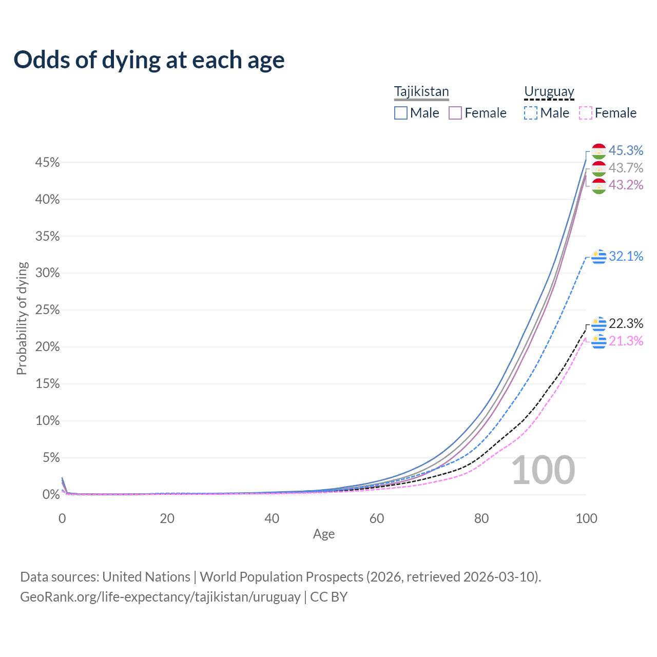 This life expectancy calculator shows the odds of living to 100, 95, 90, and below based on current age for both males and females in Tajikistan and Uruguay, along with mean and median age of death. The calculations are based on the 2026 life tables (actuarial tables) from the UN World Population Prospects.