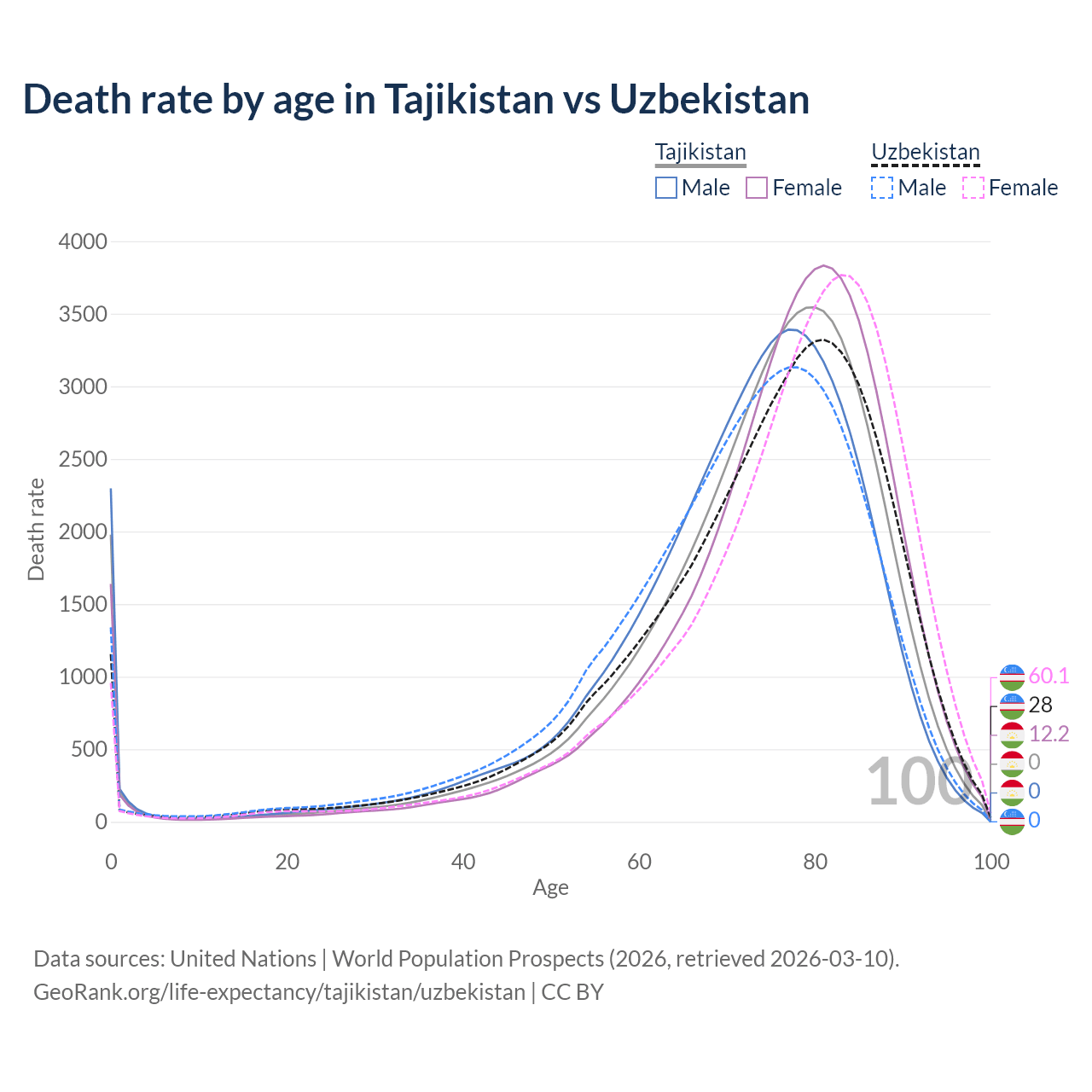 In Tajikistan, the most common age of death is 80, compared to 81 in Uzbekistan. The median age of death is 76 in Tajikistan and 76.4 in Uzbekistan, meaning only half of each cohort is expected to live past that age.