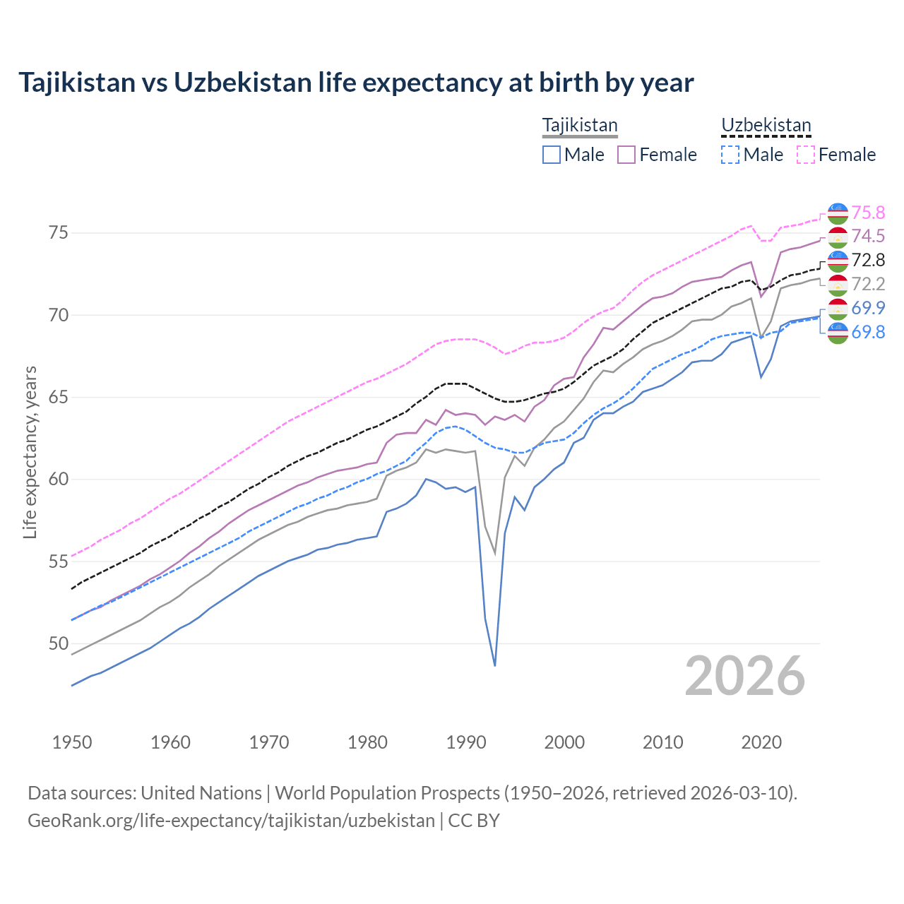 The average life expectancy at birth is 72.2 years in Tajikistan vs 72.8 in Uzbekistan. Tajikistan is ranked 121/197 by life expectancy, and Uzbekistan is 115/197. In Tajikistan, the life expectancy is 69.9 years for males and 74.5 years for females. In Uzbekistan, it's 69.8 years for males and 75.8 years for females.
