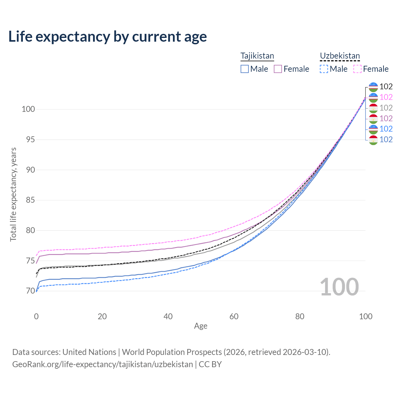 This life expectancy calculator shows the odds of living to 100, 95, 90, and below based on current age for both males and females in Tajikistan and Uzbekistan, along with mean and median age of death. The calculations are based on the 2026 life tables (actuarial tables) from the UN World Population Prospects.